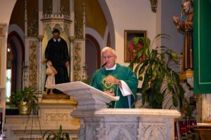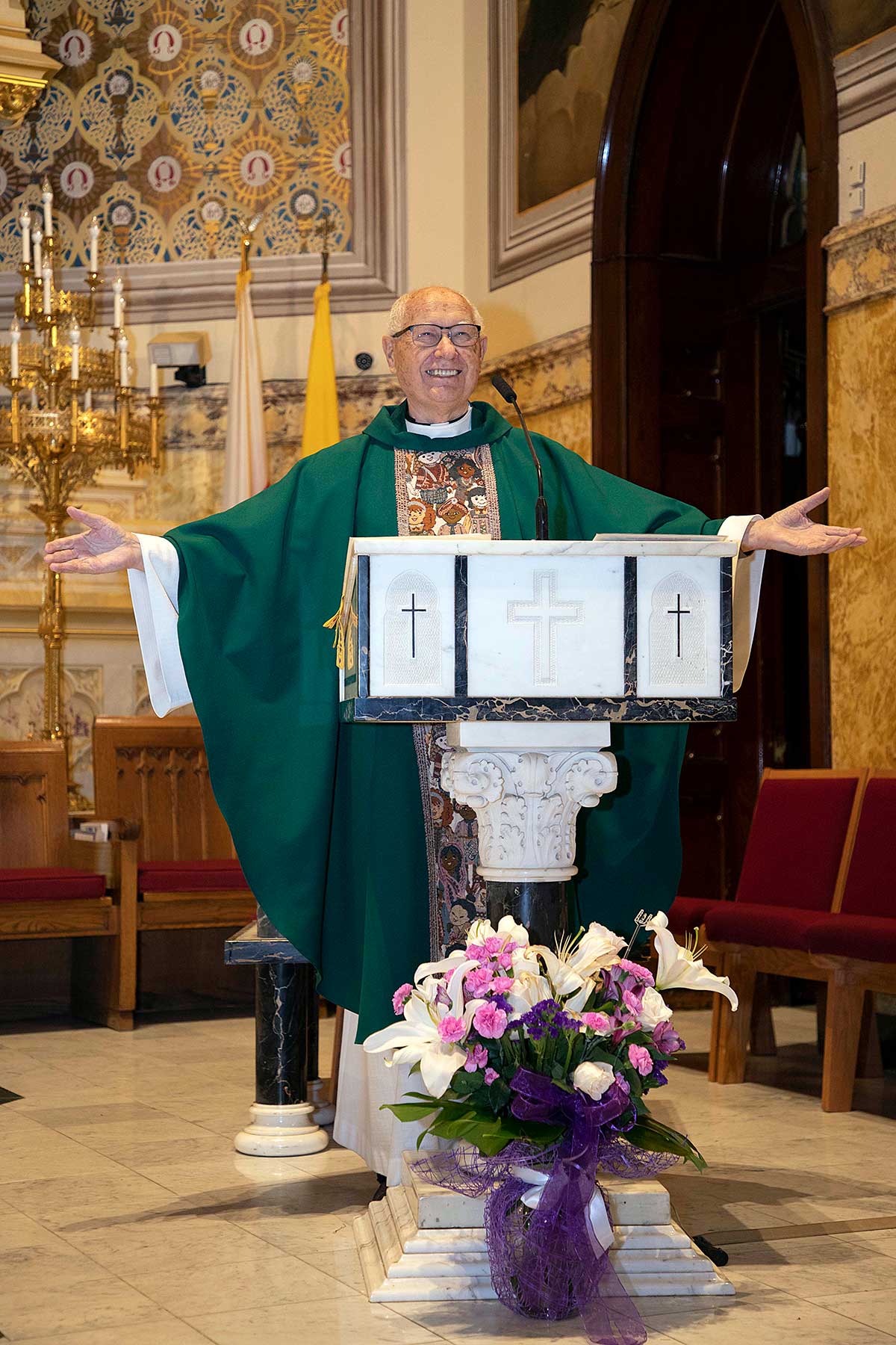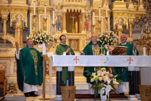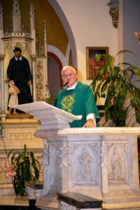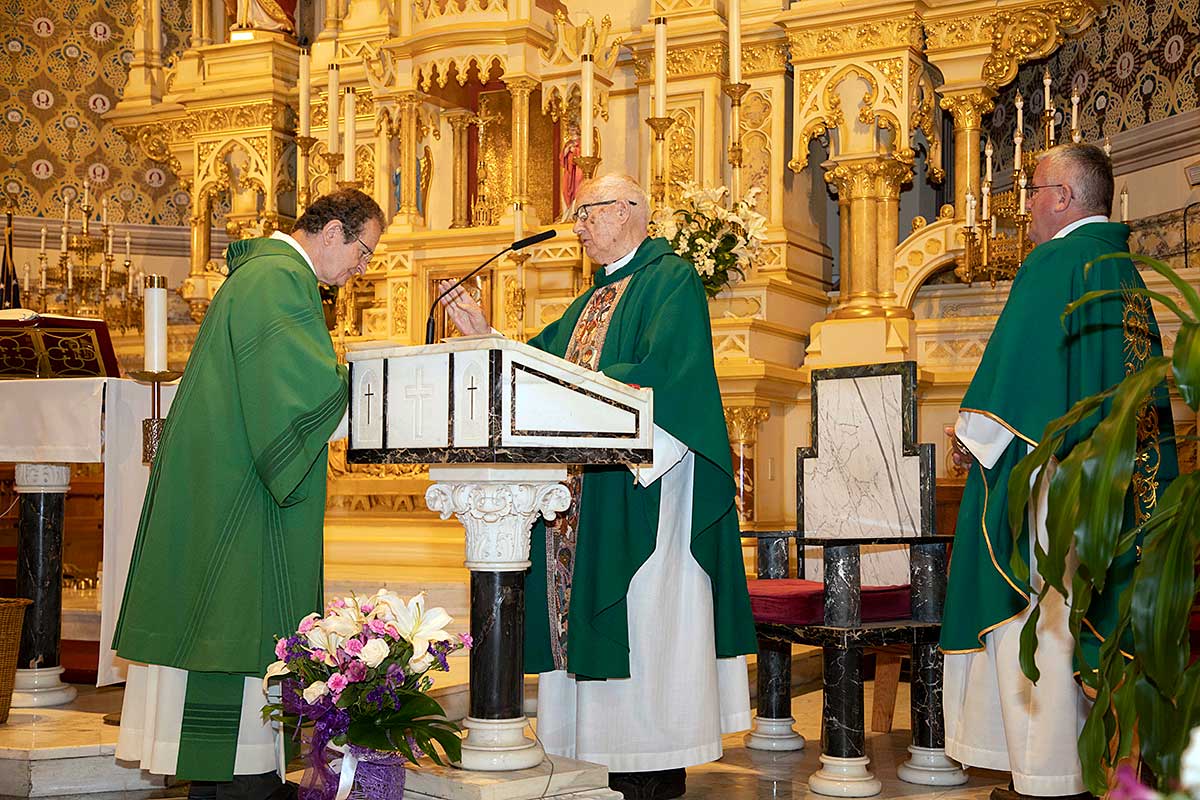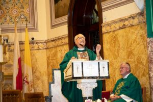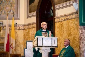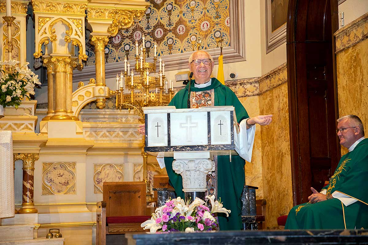 We wzruszającym kazaniu ksiądz Józef przedstawił swoją drogę do kapłaństwa rozpoczynając od pierwszej komunii Św. poprzez lata gimnazjalne, studia teologiczne oraz studia z historii sztuki. Po uzyskaniu święceń kapłańskich rozpoczął wieloletnią posługę Bożą w szeregu parafii w Polsce i USA. Najdłuższy okres bo 48 lat ksiądz Szpilski służył w kościele Św. Stanisława Kostki na Greenpoincie. Wspominał w kazaniu o niezliczonej ilości chrztów, wesel, pogrzebów, lecz najbardziej wzruszyły go dwa przypadki nawrócenia na łożu śmierci byłych kapłanów.