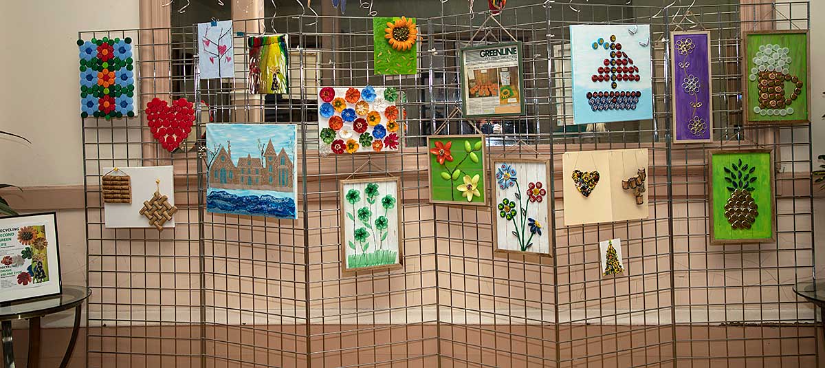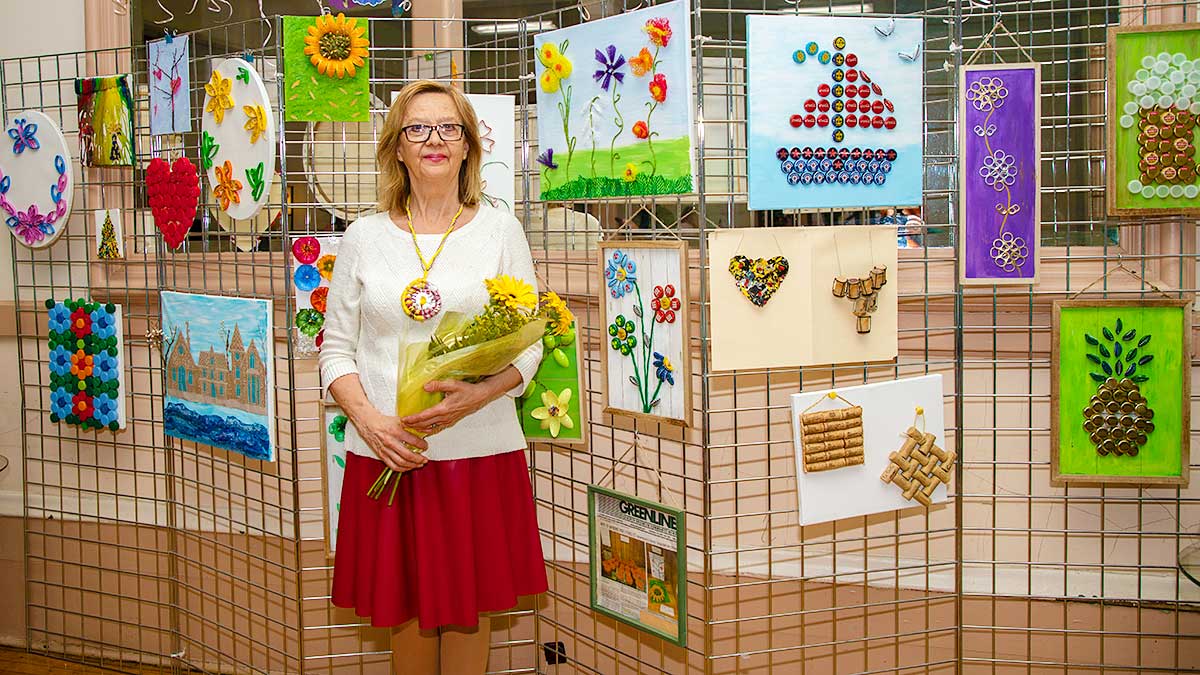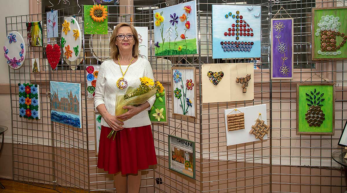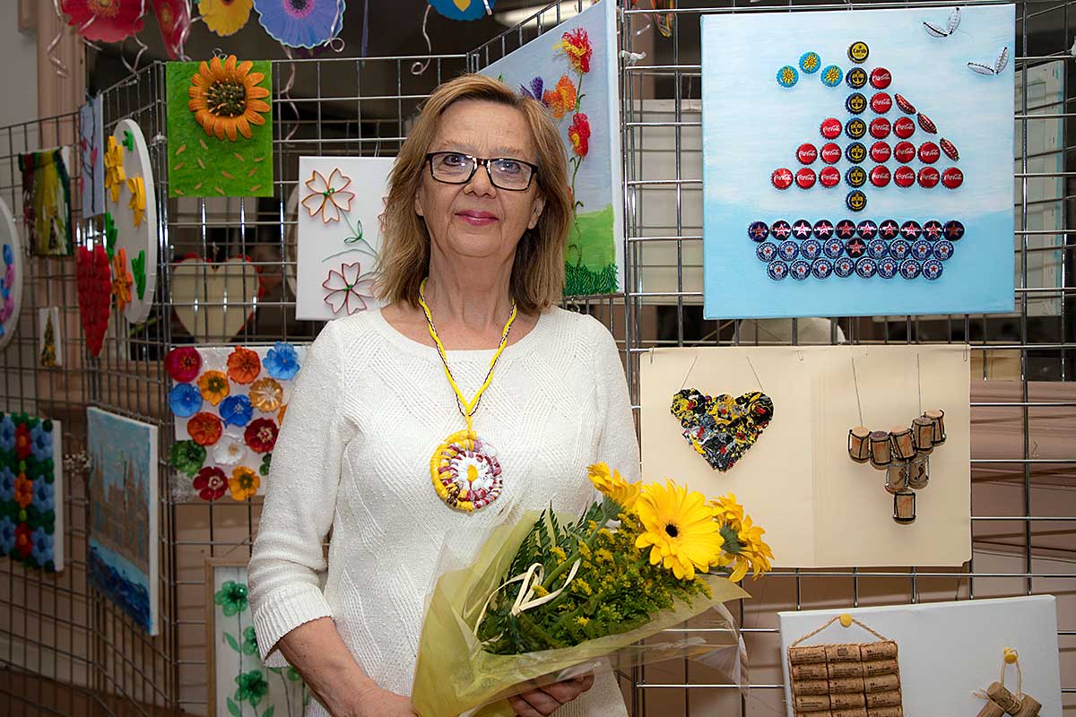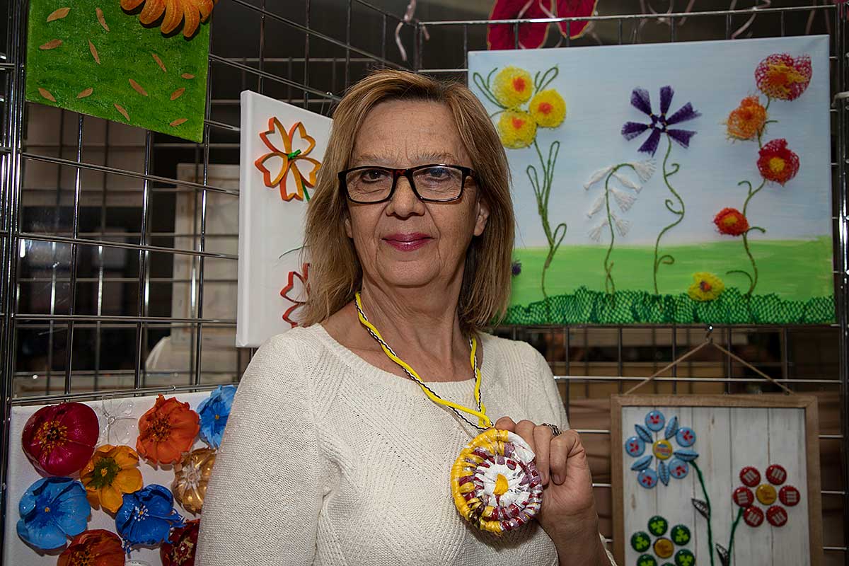 Małgorzata pokazała obrazy, kompozycje kwiatowe, kolaże, wszystko wykonane z materiałów które wyrzucamy, były tam: nakrętki od różnych butelek, folie bąbelkowe, papierowe torby z pięknymi nadrukami, plastikowe łyżeczki, otwarcia do puszek metalowych, korki, kawałki plastikowych butelek, resztki woskowych kredek, pokrojonych tekturek z rolek papieru toaletowego czy siatek z owoców i warzyw. Aż trudno uwierzyć że można było z tych odpadów stworzyć tak piękne w kształcie i kolorze obrazy.