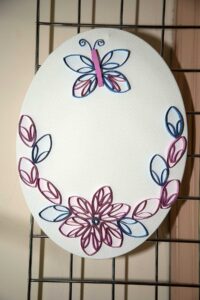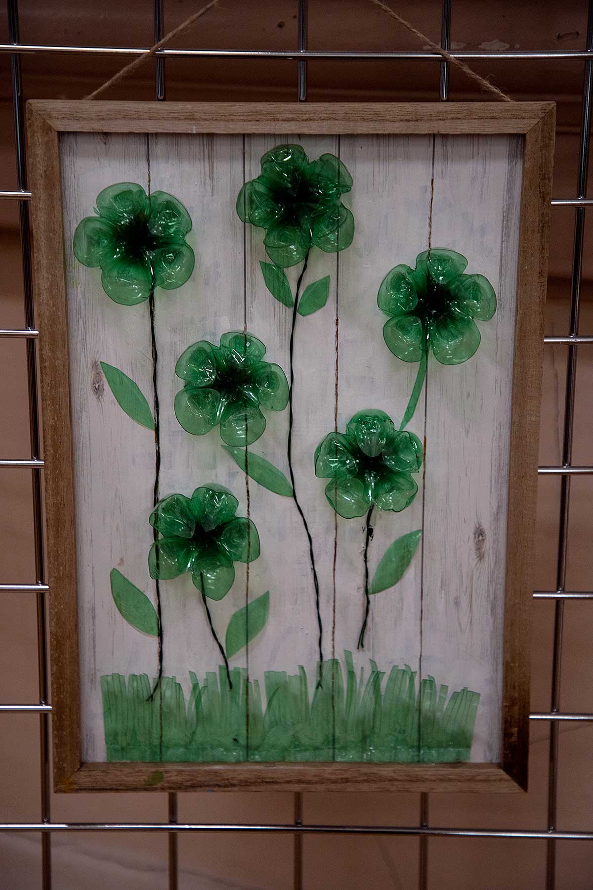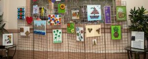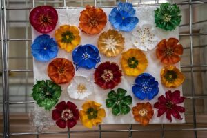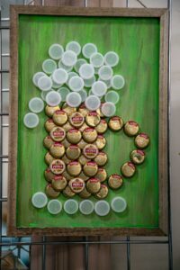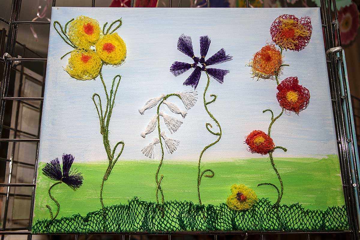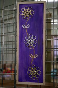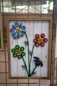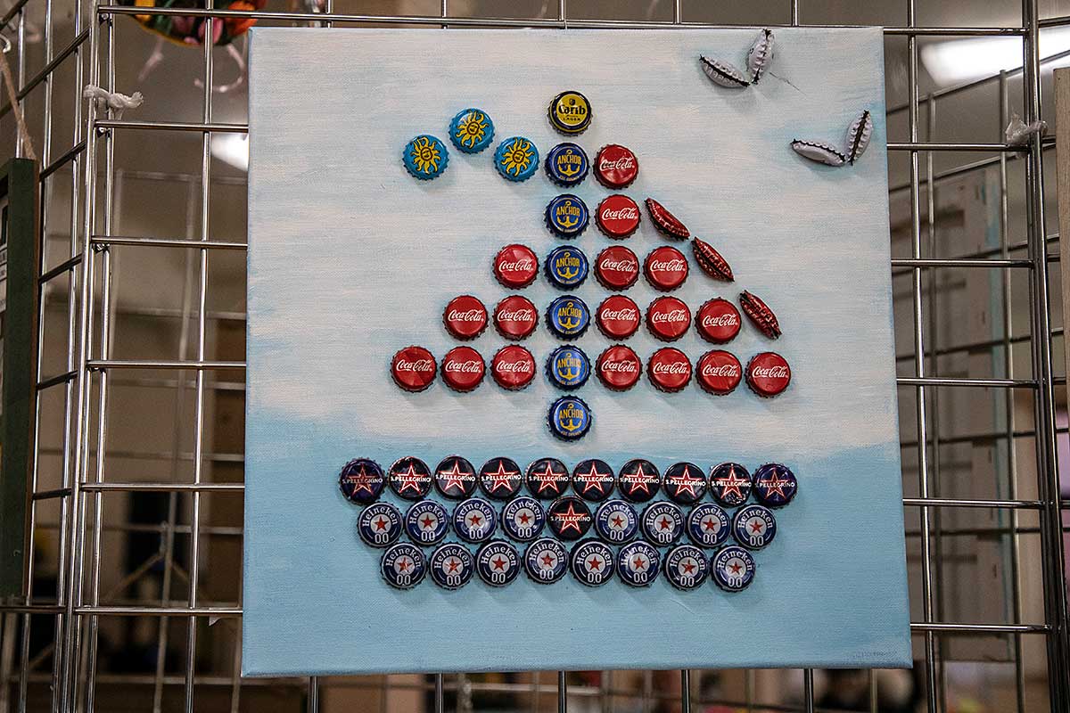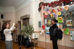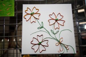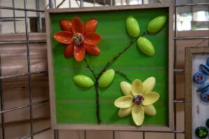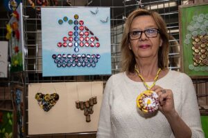 Małgorzata pokazała obrazy, kompozycje kwiatowe, kolaże, wszystko wykonane z materiałów które wyrzucamy, były tam: nakrętki od różnych butelek, folie bąbelkowe, papierowe torby z pięknymi nadrukami, plastikowe łyżeczki, otwarcia do puszek metalowych, korki, kawałki plastikowych butelek, resztki woskowych kredek, pokrojonych tekturek z rolek papieru toaletowego czy siatek z owoców i warzyw. Aż trudno uwierzyć że można było z tych odpadów stworzyć tak piękne w kształcie i kolorze obrazy.