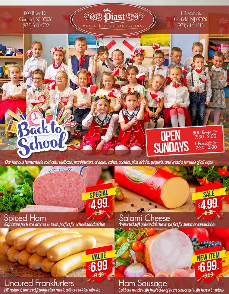 Our Spiced Ham is a beloved sandwich meat, with its signature “pork roll” flavor and delicate texture. Our famous Ham Sausage (“Kiełbasa Szynkowa”) cold cut is back…made from fresh cuts of ham and the essence of nutmeg and coriander. Both go perfect with our yellow Salami Cheese, imported all the way from Poland. And our all-natural Uncured Frankfurters are a healthy choice for kids…made without added nitrates, artificial flavors, colors, or preservatives!