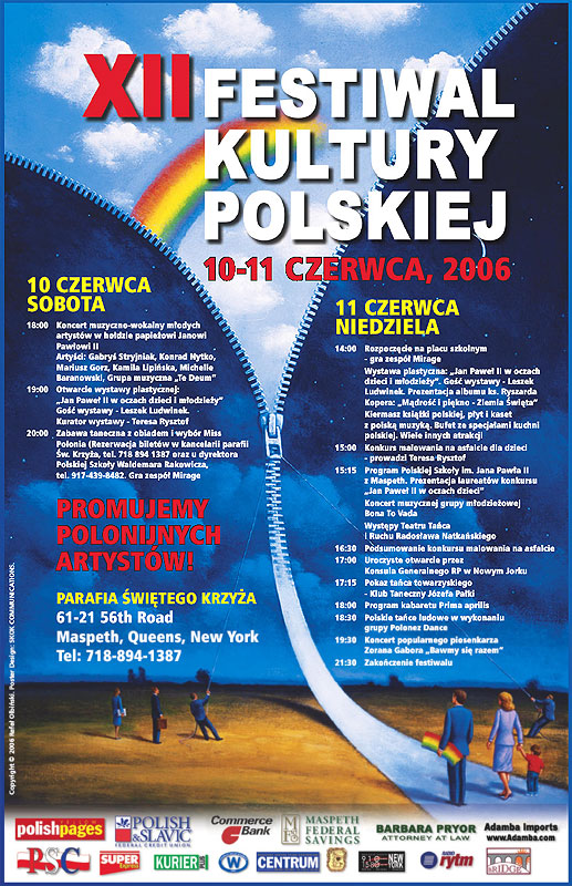 W tegorocznym festiwalu motyw papiesko- dziecięcy był ważnym elementem programu artystycznego festiwalowych dni. Otóż kilka miesięcy temu polskie szkoły z metropolii nowojorskiej i sąsiednich stanów zorganizowały konkurs pt. “Jan Paweł II w oczach dzieci”. Powstało ponad 400 prac plastycznych, wiele utworów poezji i prozy. Konkurs obejmował także śpiew, recytacje oraz instrumentalne wykonanie utworów. W sobotę wieczorem laureaci tego konkursu i goście zaprezentowali piękny program wokalno- muzyczny ku czci naszego rodaka Jana Pawła II. Wystąpili: Gabryś Stryjniak, Konrad Nytko, Kamila Lipińska, Michelle Baranowski, grupa muzyczna “Te Deum”. Po koncercie nastąpiło otwarcie wystawy plastycznej, gdzie zaprezentowano kilkadziesiąt najlepszych prac konkursowych oraz portrety papieża malowane przez Leszka Ludwinka. Ostatnim punktem sobotniego programu była zabawa taneczna podczas, której wybrano Miss Polonia z Maspeth. Została nią Katarzyna Topczewska. Wraz z marszałkami Parady Pułaskiego Jolantą i Wisławem Woźniakiem będzie prezentować parafię św. Krzyża na dorocznej Paradzie Pułaskiego w Nowym Jorku.