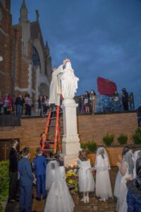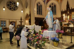 W maju ubiegłego roku było poświęcenie nowej figury, która została wzniesiona przed plebanią. Uroczystość była bardzo skromna z racji na obostrzenia związane z pandemią. Nie można było już dłużej czekać, ponieważ piękny widok figury ze śnieżnobiałego marmuru przyciągał uwagę ludzi, a mały zewnętrzny ogród stał się bezpiecznym miejscem modlitwy nawet do późnych godzin wieczornych. Kościoły były wtedy zamknięte i w tym bardzo trudnym okresie koronawirusa ludzie tym bardziej szukali pomocy i wstawiennictwa Matki Boskiej.