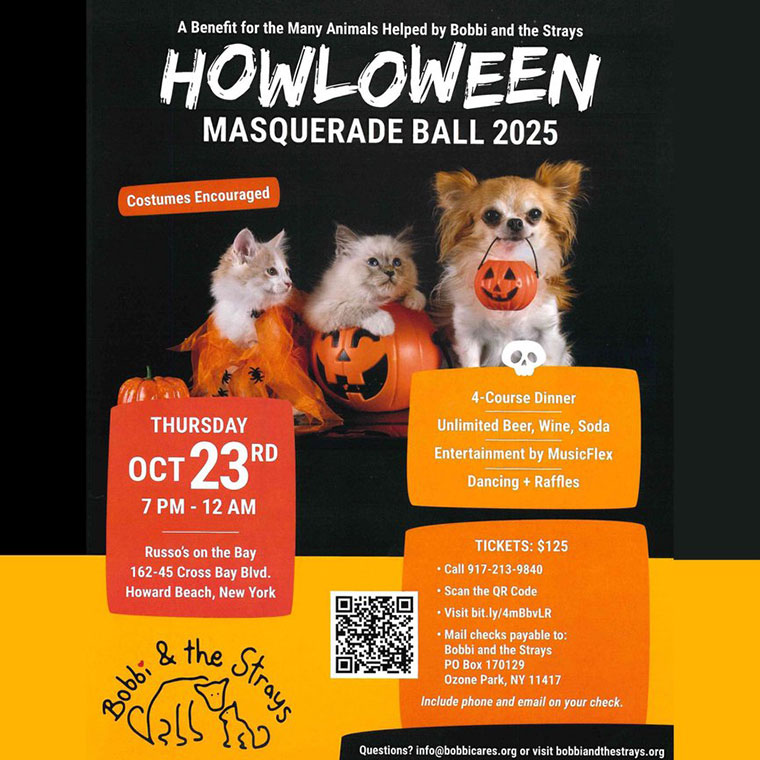 This fun event benefits Bobbi and the Strays, a non-profit rescuing cats and dogs. Enjoy costumes, a 4-course dinner with beer/wine/soda, entertainment, dancing, music, & raffles.