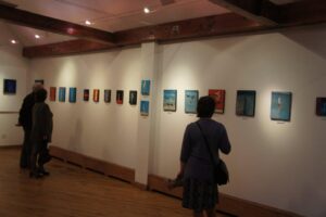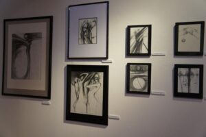 Eksponowanych było po 30 prac obydwu autorów z kilku ostatnich lat, głównie obrazy, ale także rysunki. Prace Skowrona, głównie twarze-maski o groteskowym wyrazie i postacie ekspesyjne często w ekstatycznych pozach cechuje jakieś dziwne napięcie i uczucie zawieszenia. Nowosadzki maluje samotne kobiety o kszałtach nienaturalnie wydłużonych. Umieszcza je w wieloznacznym, abstrakcyjnym tle. Jest w tych obrazach sporo magii i erotyki.