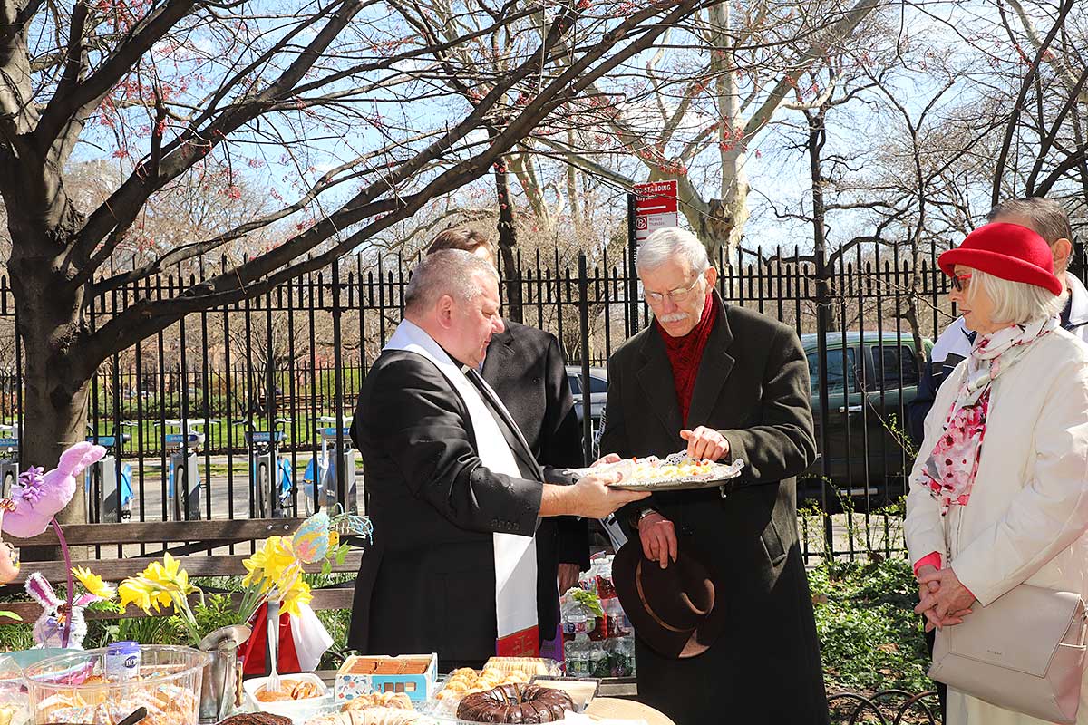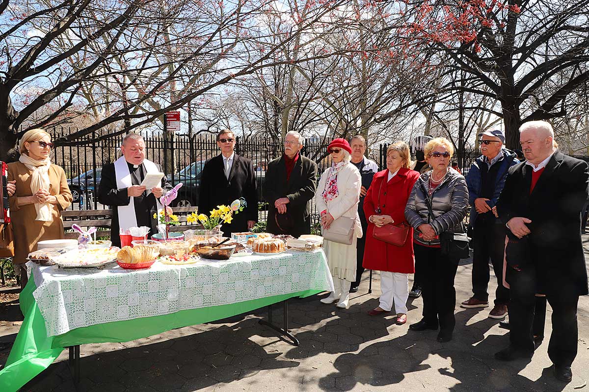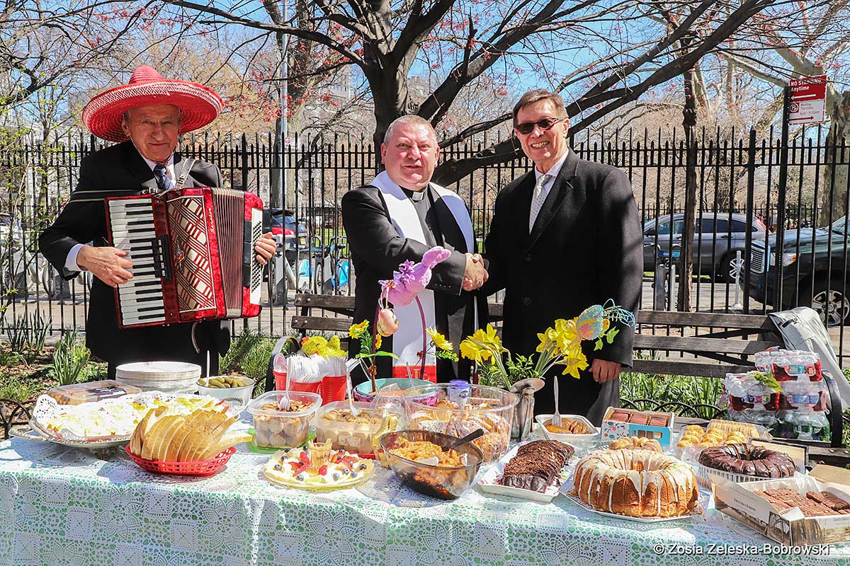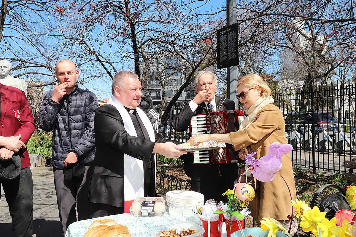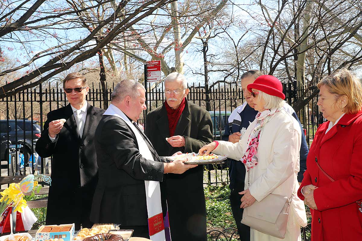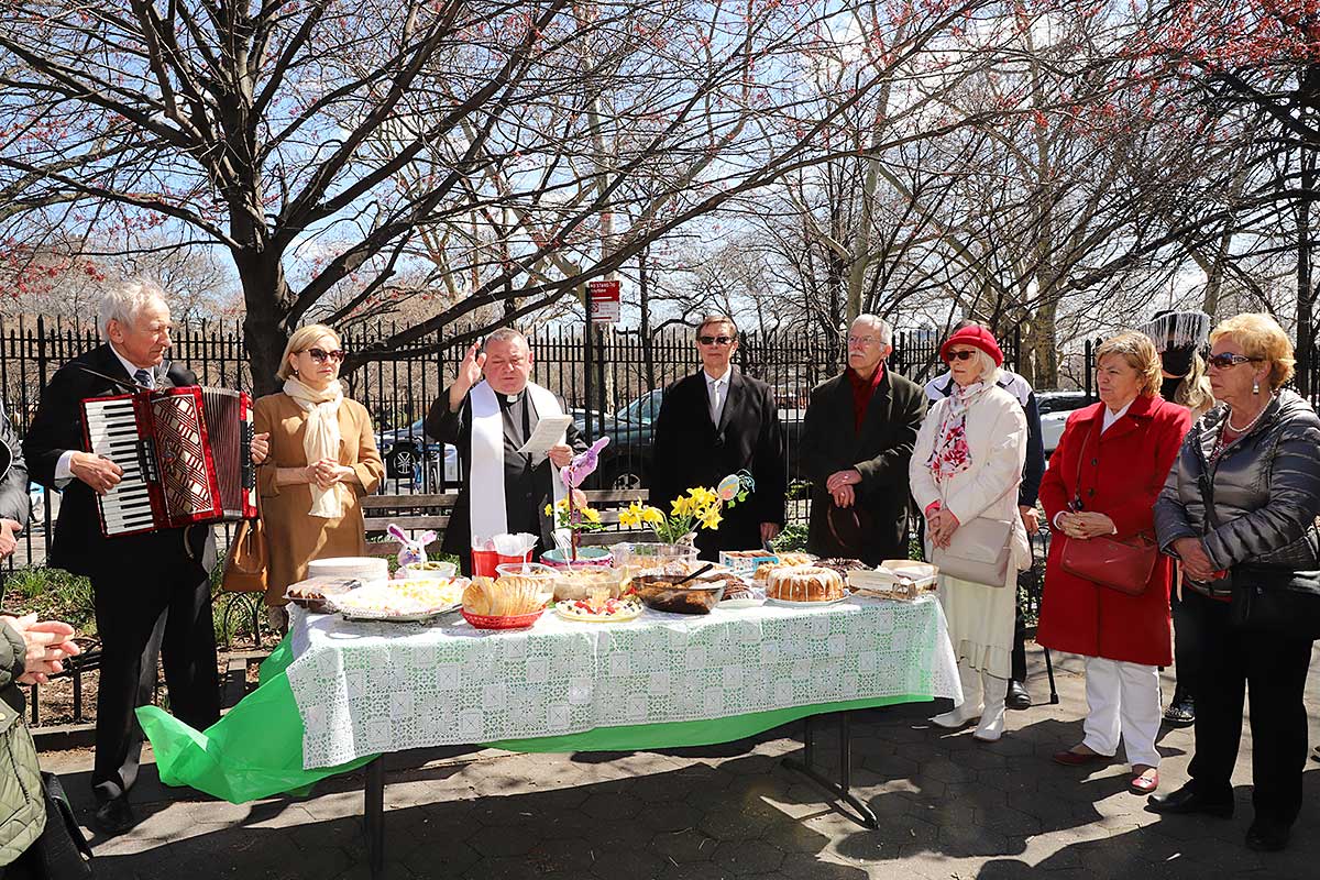 Zaproszony ksiądz Grzegorz Markulak, proboszcz Parafii Św. Stanisława Kostki na Greenpoincie powiedział: “Po zakończeniu 40 dniowego czasu Wielkiego Postu gromadzimy się w Uroczystość Zmartwychwstania Pańskiego. W naszych sercach jest wielka radość, bo Chrystus żyje i jest pośród nas. Razem z nim jesteśmy tu w tej wspólnocie przy Wielkanocnym stole, by dzielić się miłością, składać sobie wzajemnie życzenia, dzielić się poświęconym jajkiem, znakiem nowego życia. Prośmy Chrystusa zawsze obecnego wśród tych, którzy Go miłują, aby pobłogosławił pokarmy na naszym wielkanocnym stole”.