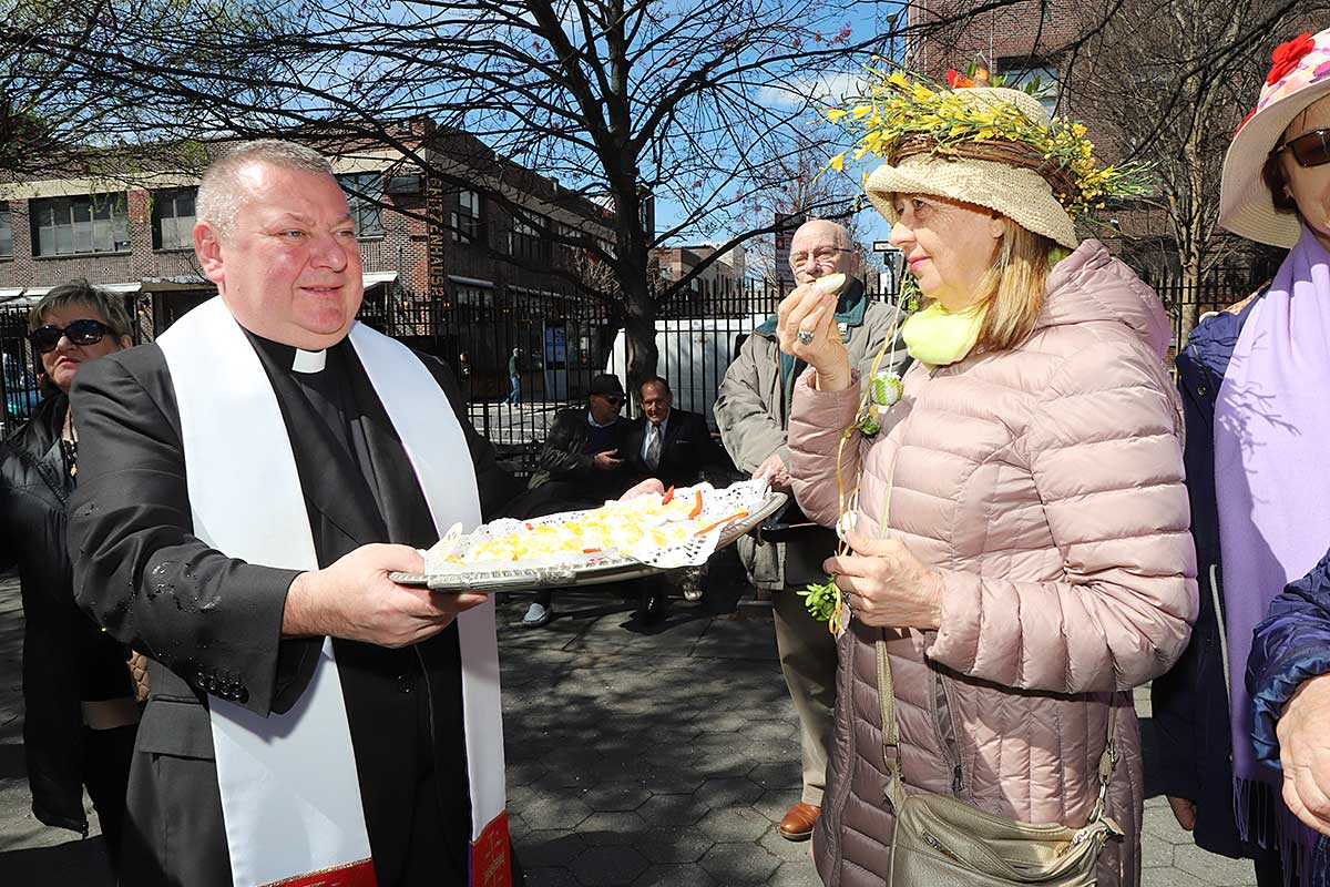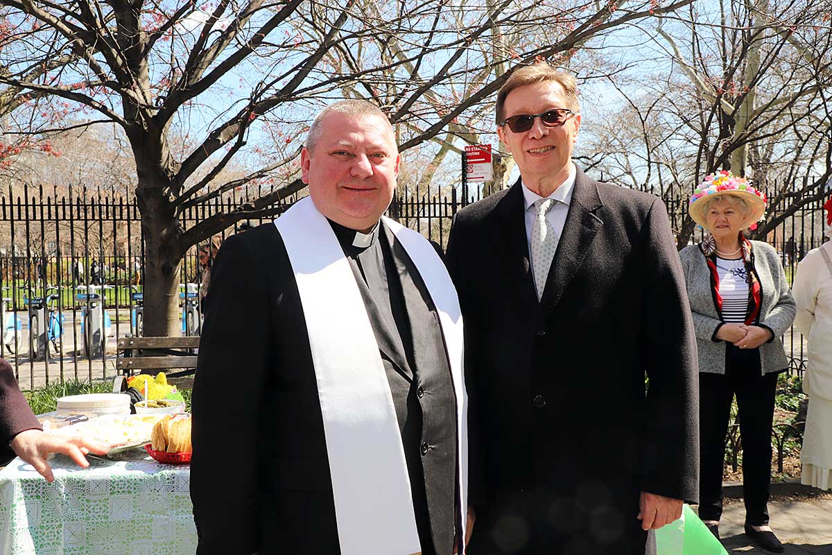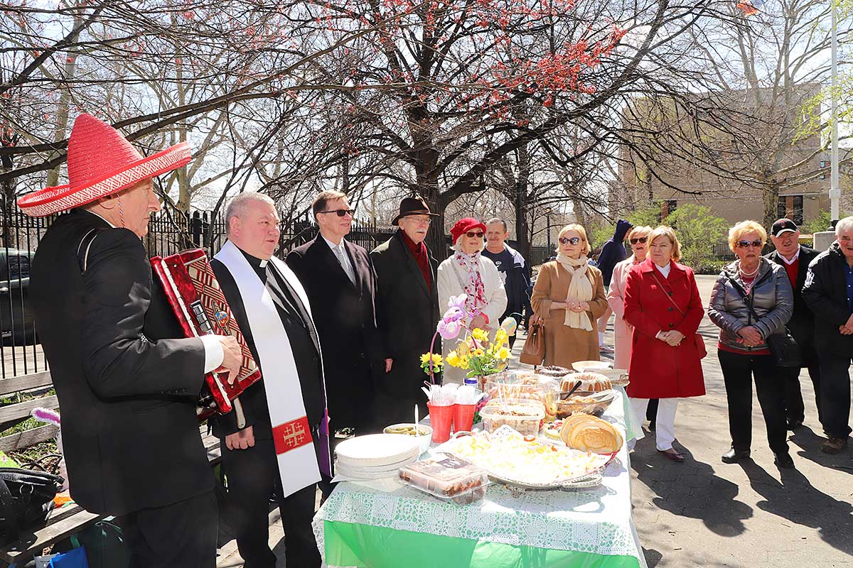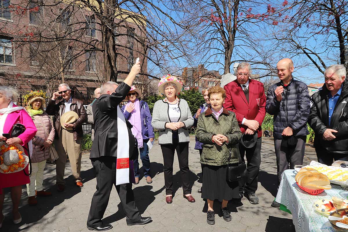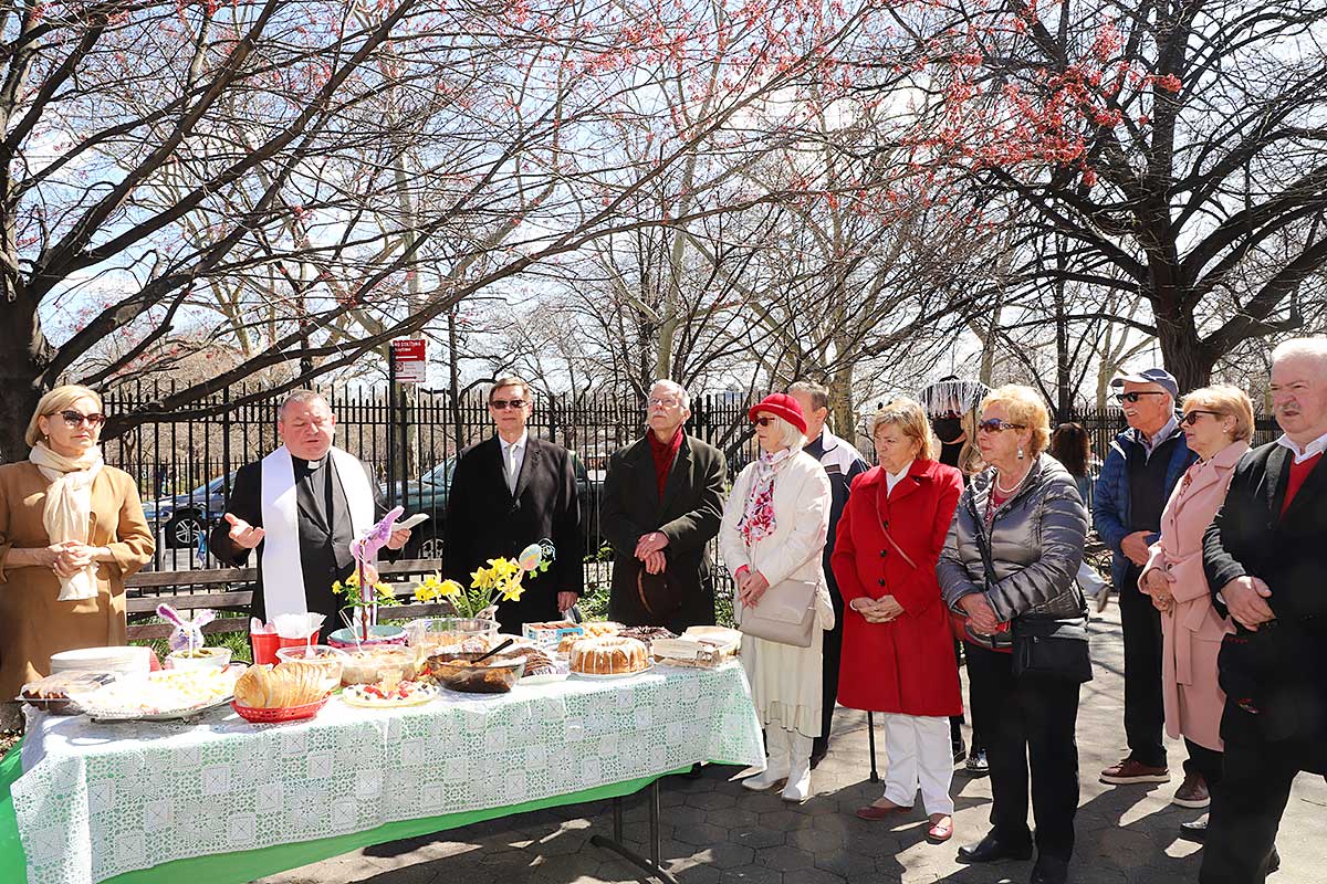 Zaproszony ksiądz Grzegorz Markulak, proboszcz Parafii Św. Stanisława Kostki na Greenpoincie powiedział: “Po zakończeniu 40 dniowego czasu Wielkiego Postu gromadzimy się w Uroczystość Zmartwychwstania Pańskiego. W naszych sercach jest wielka radość, bo Chrystus żyje i jest pośród nas. Razem z nim jesteśmy tu w tej wspólnocie przy Wielkanocnym stole, by dzielić się miłością, składać sobie wzajemnie życzenia, dzielić się poświęconym jajkiem, znakiem nowego życia. Prośmy Chrystusa zawsze obecnego wśród tych, którzy Go miłują, aby pobłogosławił pokarmy na naszym wielkanocnym stole”.