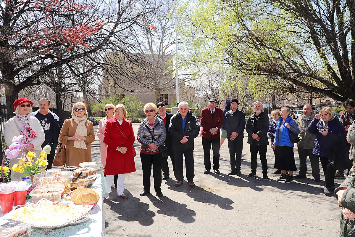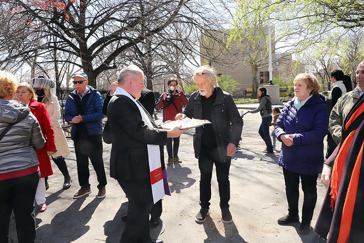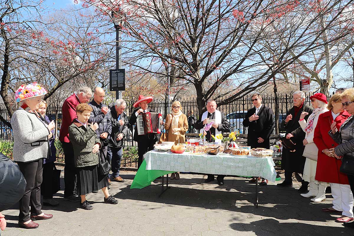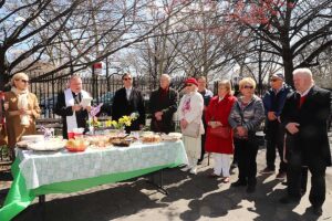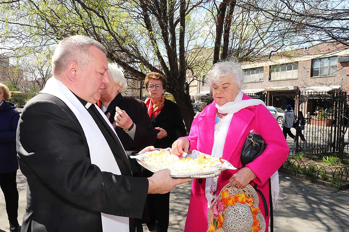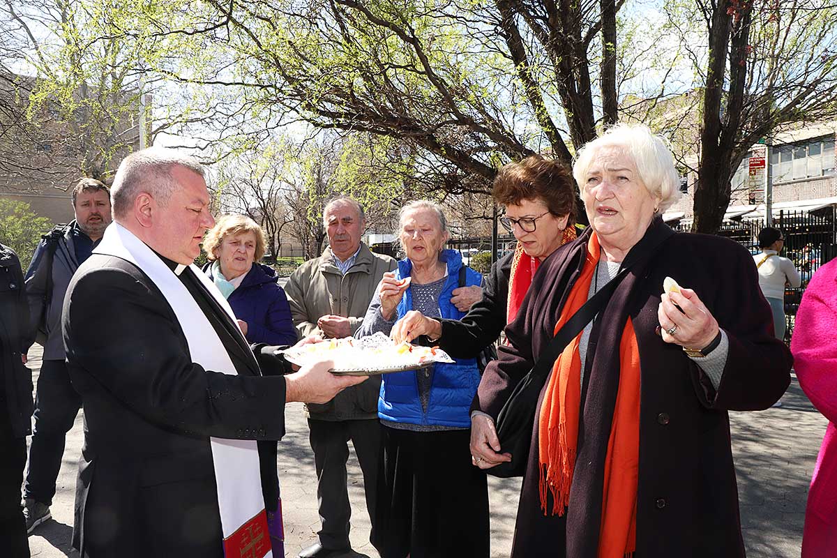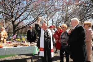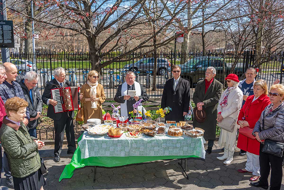 Zaproszony ksiądz Grzegorz Markulak, proboszcz Parafii Św. Stanisława Kostki na Greenpoincie powiedział: “Po zakończeniu 40 dniowego czasu Wielkiego Postu gromadzimy się w Uroczystość Zmartwychwstania Pańskiego. W naszych sercach jest wielka radość, bo Chrystus żyje i jest pośród nas. Razem z nim jesteśmy tu w tej wspólnocie przy Wielkanocnym stole, by dzielić się miłością, składać sobie wzajemnie życzenia, dzielić się poświęconym jajkiem, znakiem nowego życia. Prośmy Chrystusa zawsze obecnego wśród tych, którzy Go miłują, aby pobłogosławił pokarmy na naszym wielkanocnym stole”.