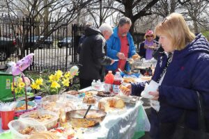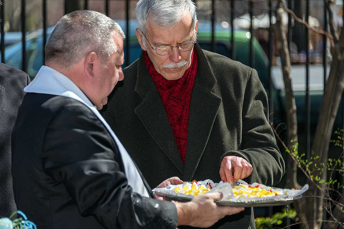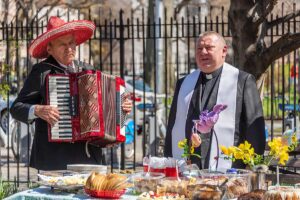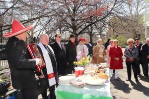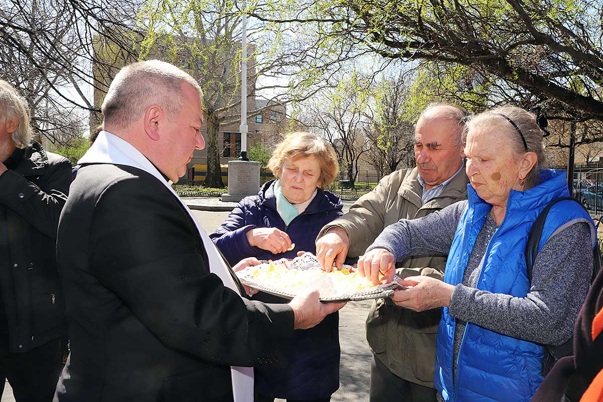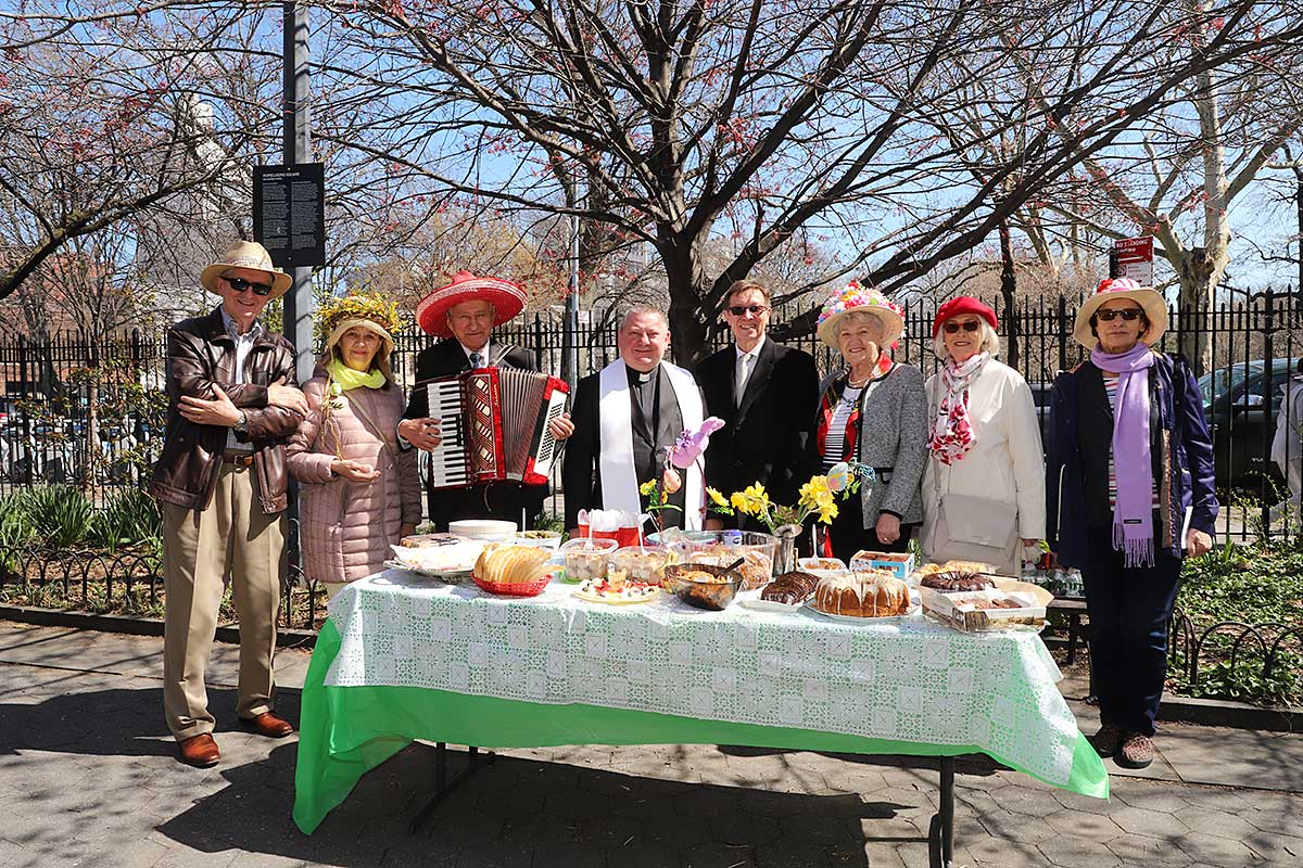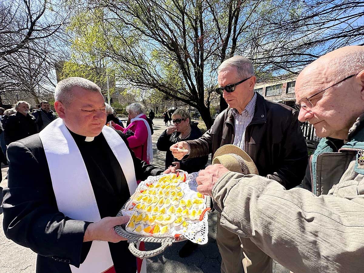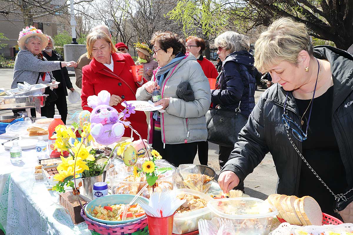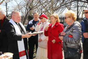 Zaproszony ksiądz Grzegorz Markulak, proboszcz Parafii Św. Stanisława Kostki na Greenpoincie powiedział: “Po zakończeniu 40 dniowego czasu Wielkiego Postu gromadzimy się w Uroczystość Zmartwychwstania Pańskiego. W naszych sercach jest wielka radość, bo Chrystus żyje i jest pośród nas. Razem z nim jesteśmy tu w tej wspólnocie przy Wielkanocnym stole, by dzielić się miłością, składać sobie wzajemnie życzenia, dzielić się poświęconym jajkiem, znakiem nowego życia. Prośmy Chrystusa zawsze obecnego wśród tych, którzy Go miłują, aby pobłogosławił pokarmy na naszym wielkanocnym stole”.