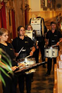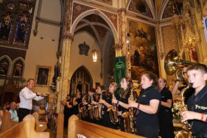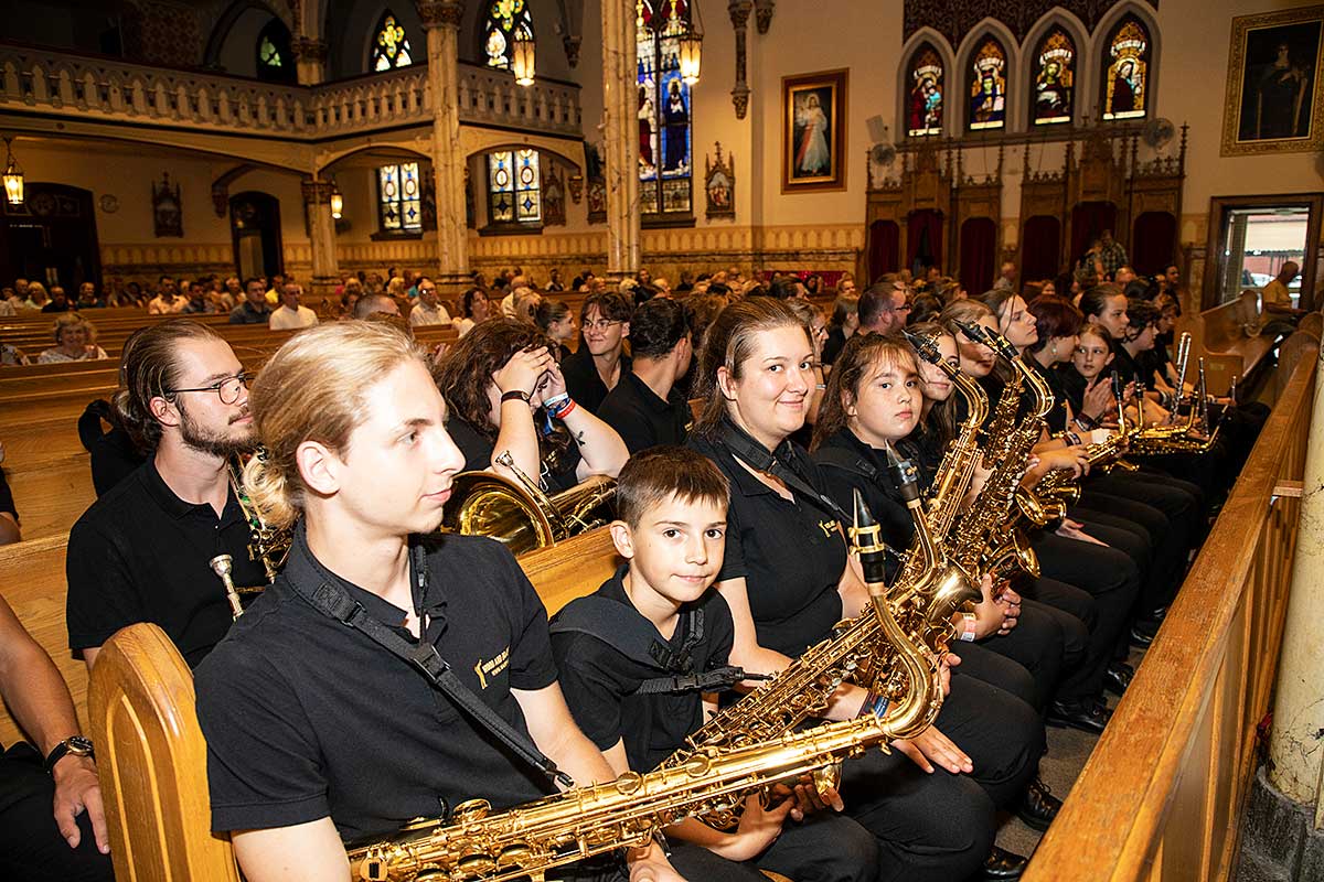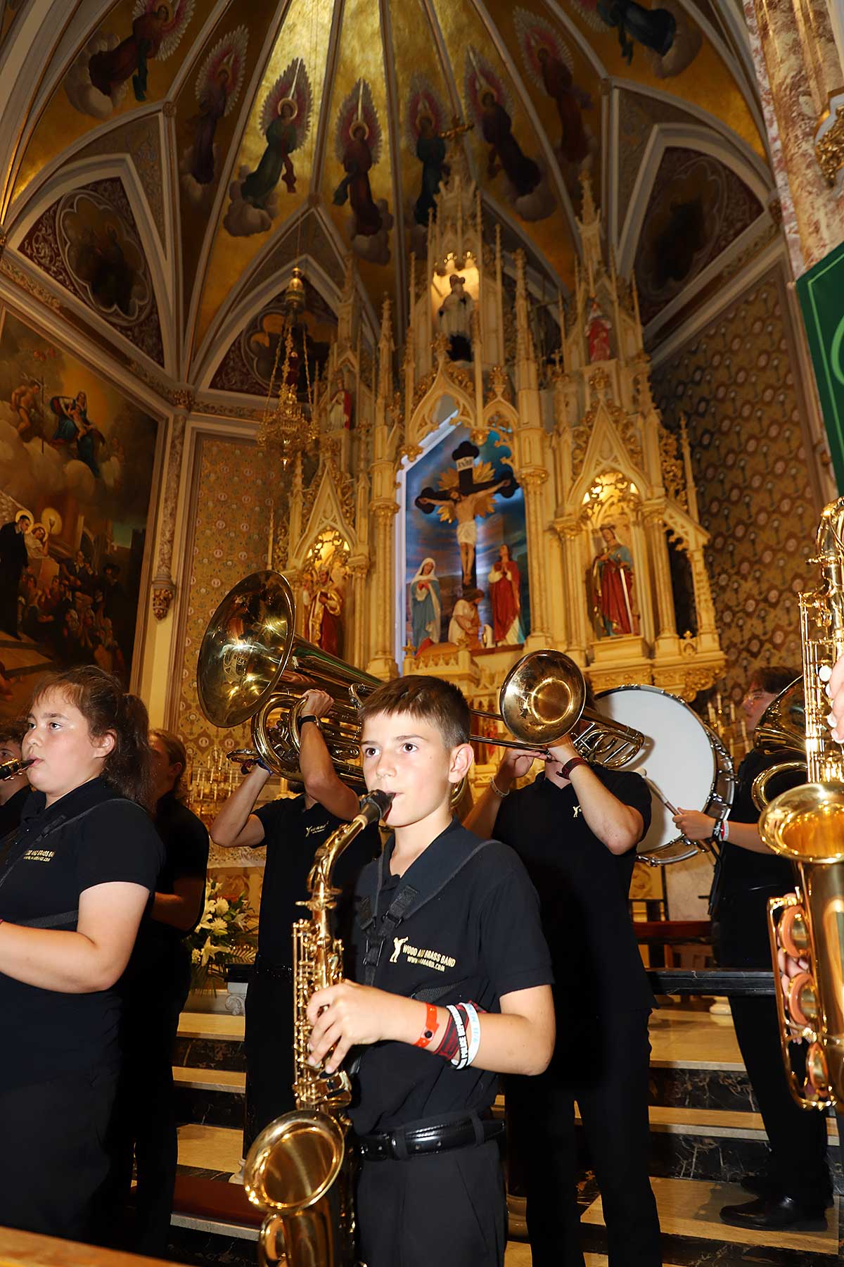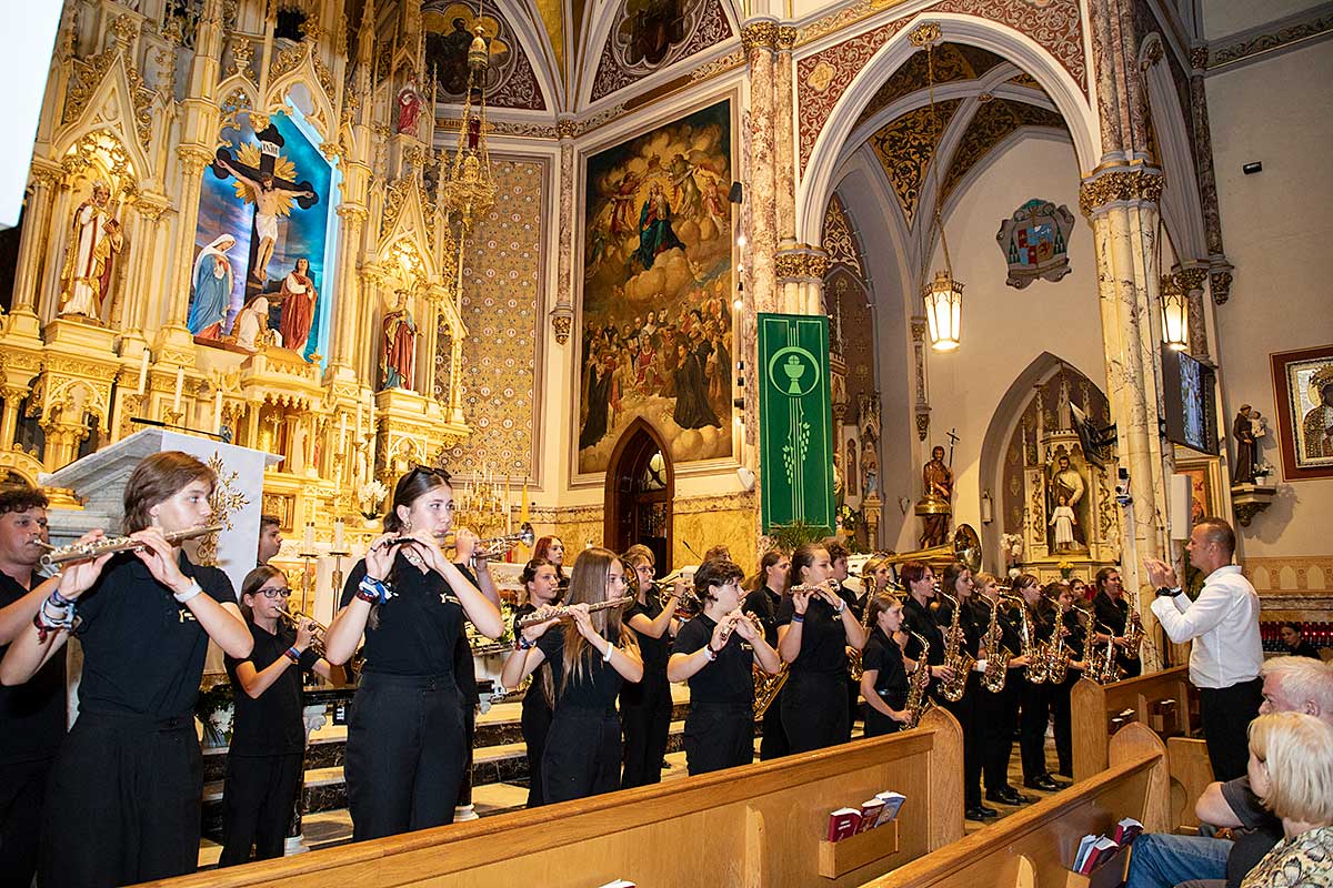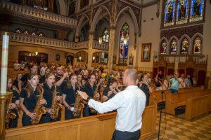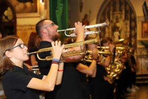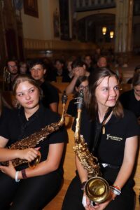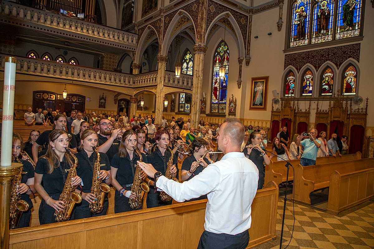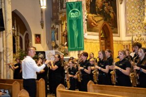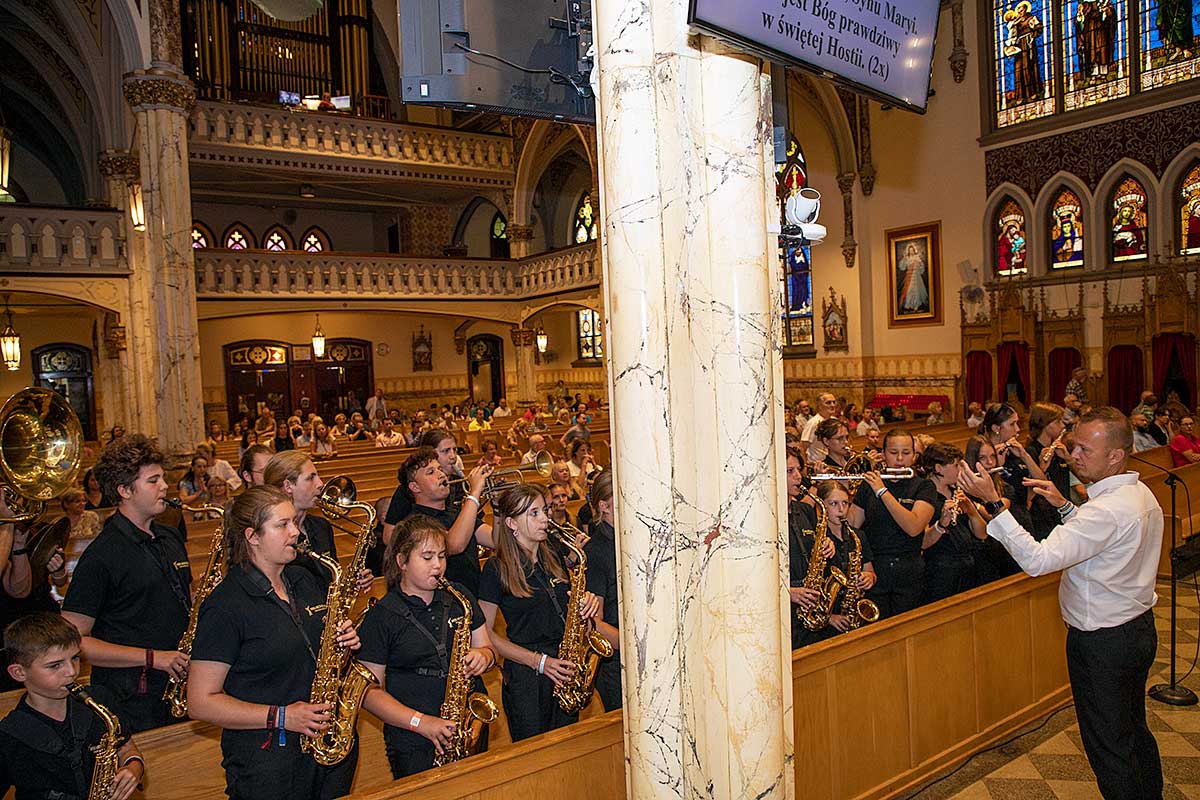 Koncert rozpoczął się bezpośrednio po Mszy Św. Orkiestra stojąc przed ołtarzem zagrała m.in. “Boże coś Polskę”, “Unity”, utwór powstały na 15-lecie powstania orkiestry, oraz melodie wojskowe z okazji nadchodzącej rocznicy wybuchu Powstania Warszawskiego,. W wielkiej, akustycznej przestrzeni kościoła głos orkiestry brzmiał wspaniale. Tu również słuchacze, uczestnicy Mszy Św. zgotowali orkiestrze gorącą owację.