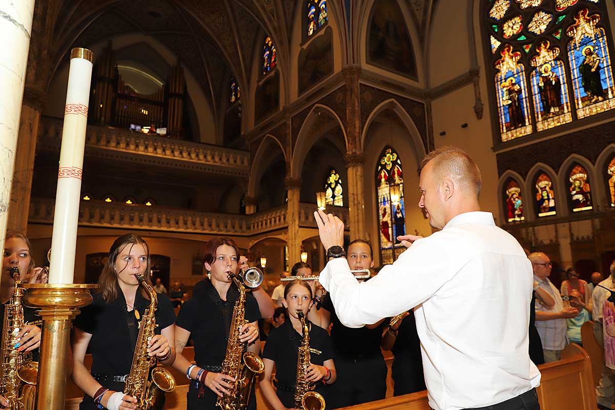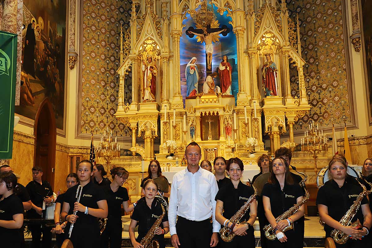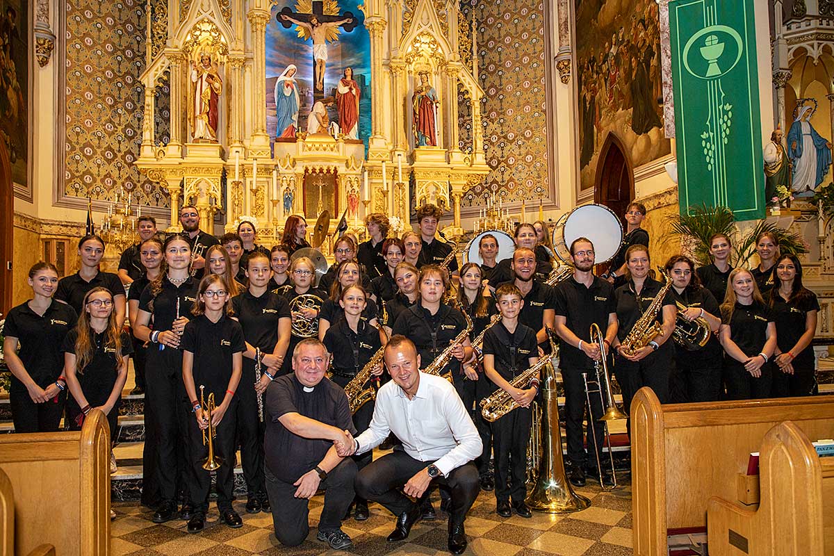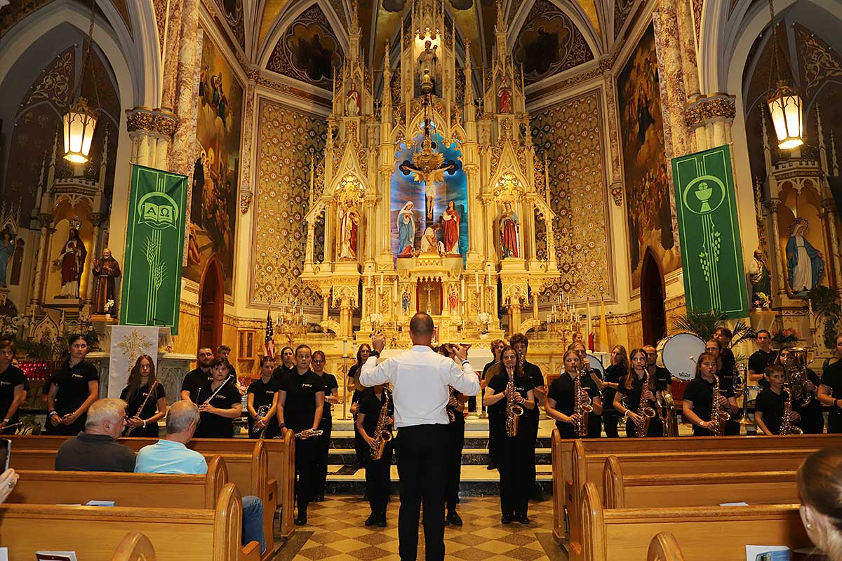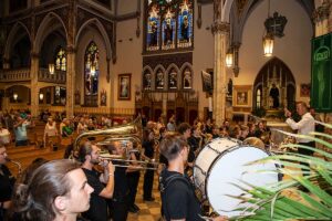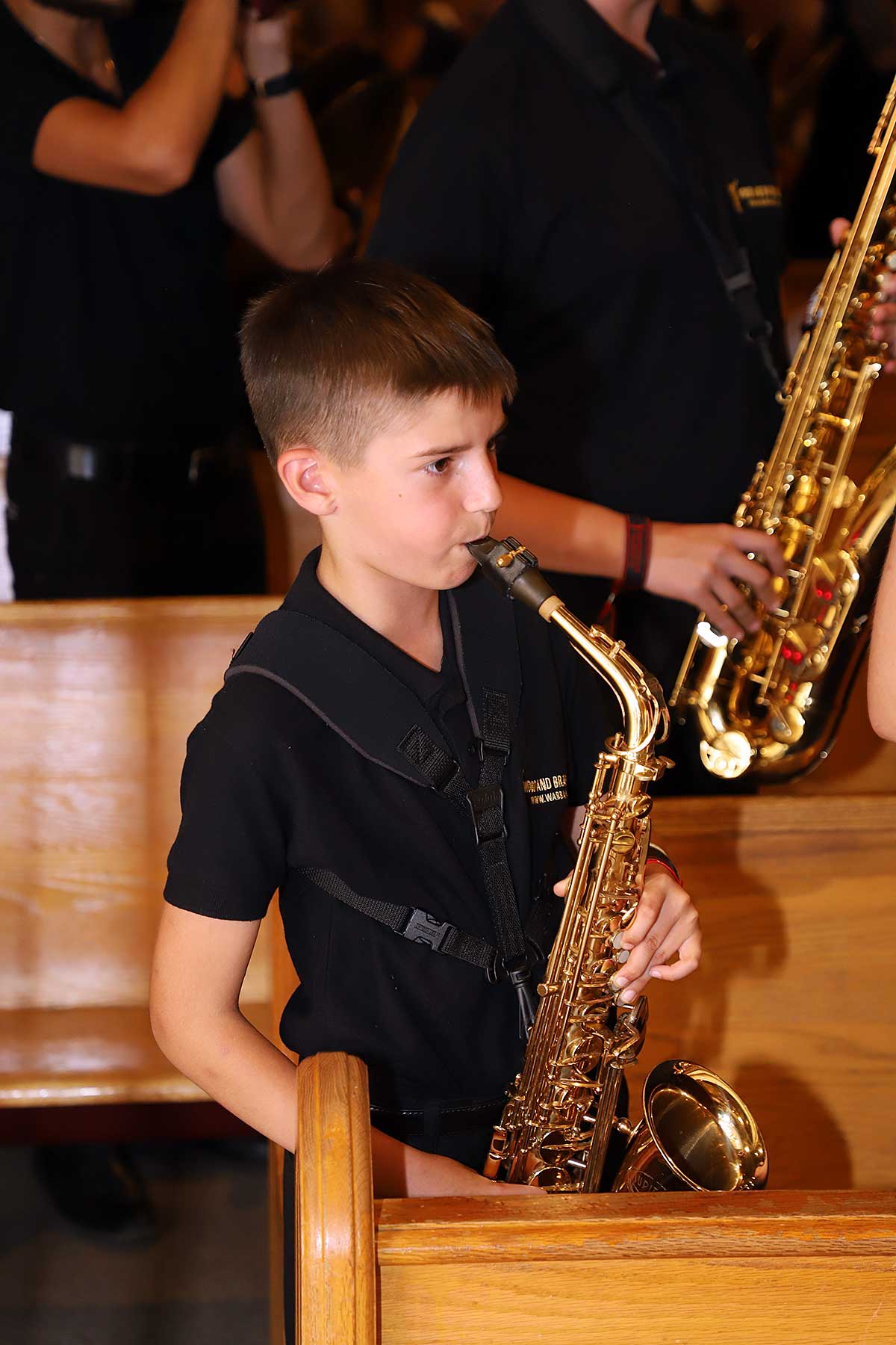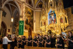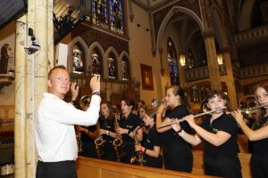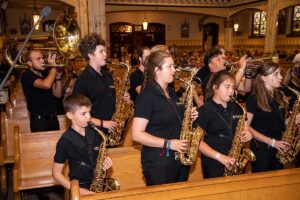 Koncert rozpoczął się bezpośrednio po Mszy Św. Orkiestra stojąc przed ołtarzem zagrała m.in. “Boże coś Polskę”, “Unity”, utwór powstały na 15-lecie powstania orkiestry, oraz melodie wojskowe z okazji nadchodzącej rocznicy wybuchu Powstania Warszawskiego,. W wielkiej, akustycznej przestrzeni kościoła głos orkiestry brzmiał wspaniale. Tu również słuchacze, uczestnicy Mszy Św. zgotowali orkiestrze gorącą owację.
