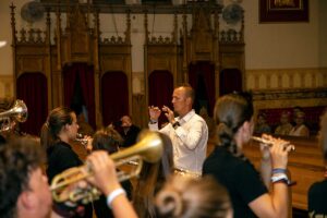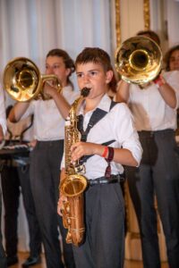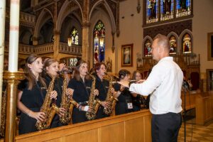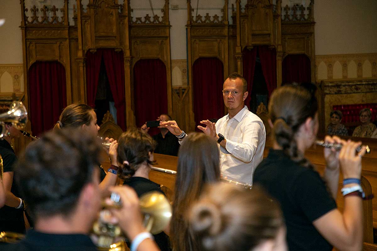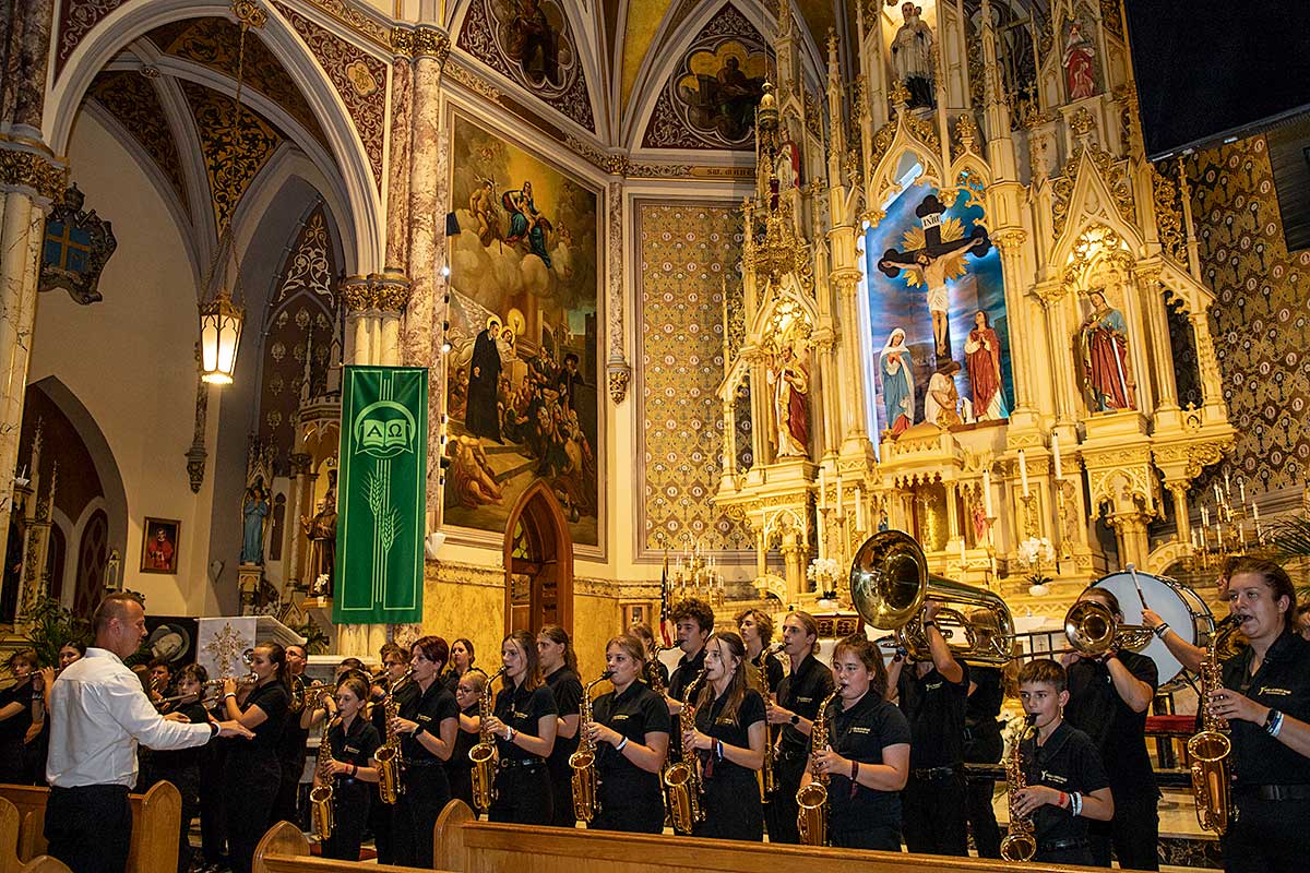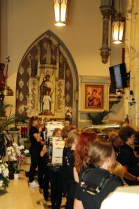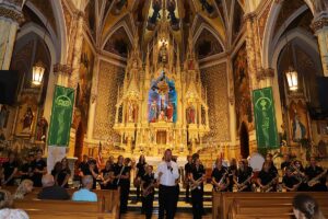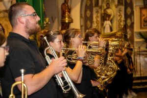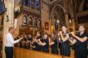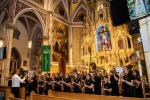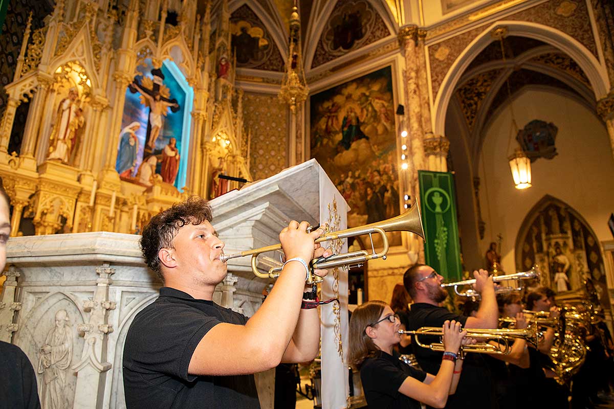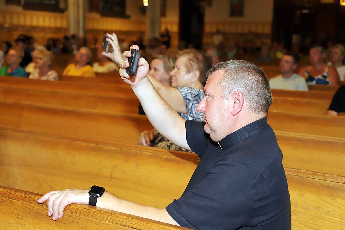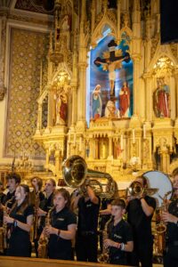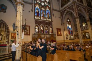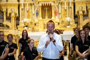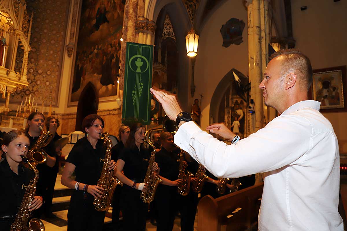 Koncert rozpoczął się bezpośrednio po Mszy Św. Orkiestra stojąc przed ołtarzem zagrała m.in. “Boże coś Polskę”, “Unity”, utwór powstały na 15-lecie powstania orkiestry, oraz melodie wojskowe z okazji nadchodzącej rocznicy wybuchu Powstania Warszawskiego,. W wielkiej, akustycznej przestrzeni kościoła głos orkiestry brzmiał wspaniale. Tu również słuchacze, uczestnicy Mszy Św. zgotowali orkiestrze gorącą owację.
