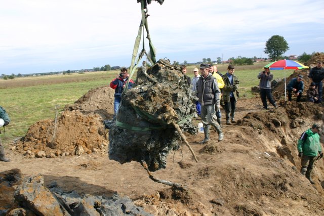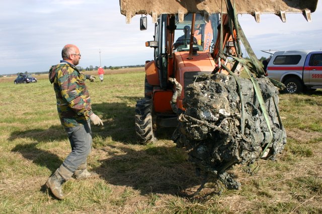Wydobycie ważącego ponad 500 kg Daimler-Benza wymagało użycia ciężkiego sprzętu. Wszystko zakończyło się pomyślnie i po kilku godzinach pracy silnik stał na łące oczyszczony z oblepiającej go gliny. Jest uszkodzony i będzie wymagał poważnych prac konserwatorskich. Natomiast doskonale zachowała się piasta śmigła.