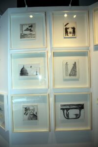 Na bardzo starannie przygotowanej wystawie “Moje życie w obrazach”, na której pokazał ponad 150 prac, mogliśmy zobaczyć: filozoficzne sentencje opatrzone rysunkami, godne genialnego myśliciela, prace kolorowe, trójwymiarowe przestrzenne obrazy będące zadumą nad złotym podziałem, który jest najważniejszą proporcją na świecie, obrazy olejne oraz plakaty. Ponadto pokazał olbrzymi dorobek archiwalny, strony z New York Timesa, Wall Street Journal, Washington Post, Rzeczpospolitej, Polityki i Gazety Wyborczej, pism i gazet które drukowały jego rysunki. Dwa tomy zbiorcze albumów “Plus i Minus” – “Podręcznik do myślenia” powstałe z cotygodniowych rysunków drukowanych w Rzeczpospolitej. W 1995 natomiast ukazała się książka “Janusz Kapusta w New York Timesie”.