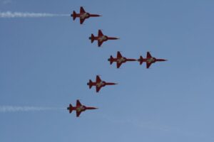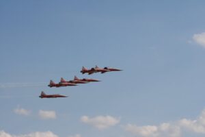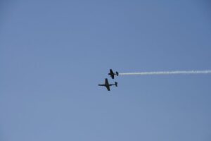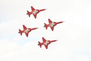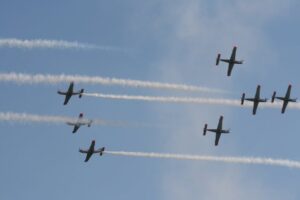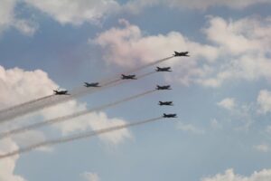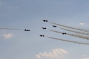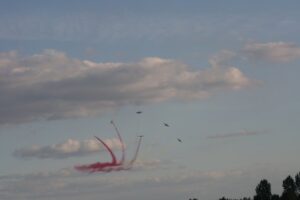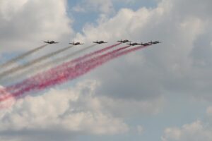 W tym roku na radomskim niebie zobaczyliśmy siedem zespołów akrobacyjnych, w tym cztery z zagranicy: szwajcarski “Patrouille Suisse” na samolotach F-5 Tiger, łotewski “Baltic Bees” na L-39 Albatros, chorwacki “Wings of Storm” na turbośmigłowych PC-9M oraz fiński “Midnight Hawks” na samolotach Hawk, oraz polskie gwiazdy akrobacji lotniczej “Biało-Czerwone Iskry”, “Orliki” i “Żelazny”.
