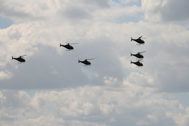 W południe pokazy zostały otwarte imponującą uroczystą defiladą 46 samolotów i śmigłowców Polskich Sił Powietrznych. Maszyny przeleciały na wysokości od 150 do 300 metrów. Defiladę otworzyły samoloty z grupy akrobatycznej “Biało czerwone Iskry”, które pozostawiły za sobą smugi biało czerwonego dymu. Po nich przeleciało sześć śmigłowców szkolnych SW-4 Puszczyk, a potem formacja ośmiu samolotów PZL-130 Orlik. Następnie przyszła kolei na samoloty transportowe, trzy M28 Bryza i grupę złożoną z jednego C-130 Hercules i dwóch C-295M.