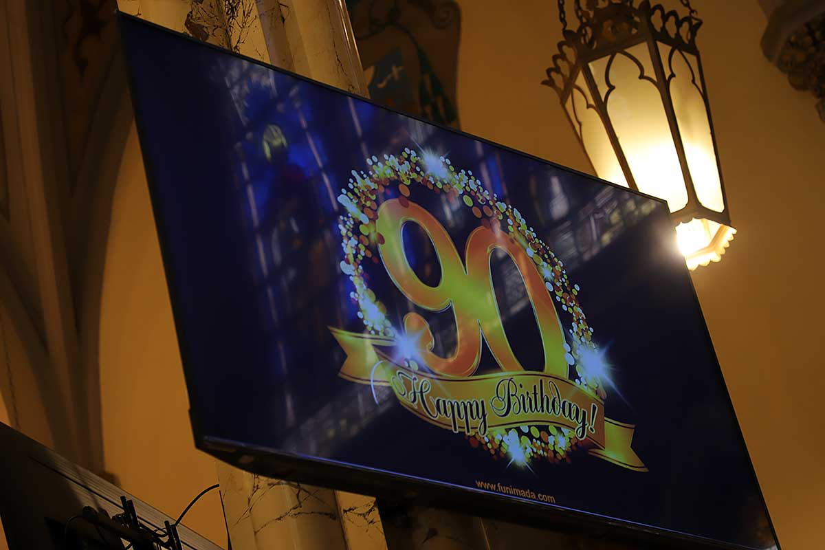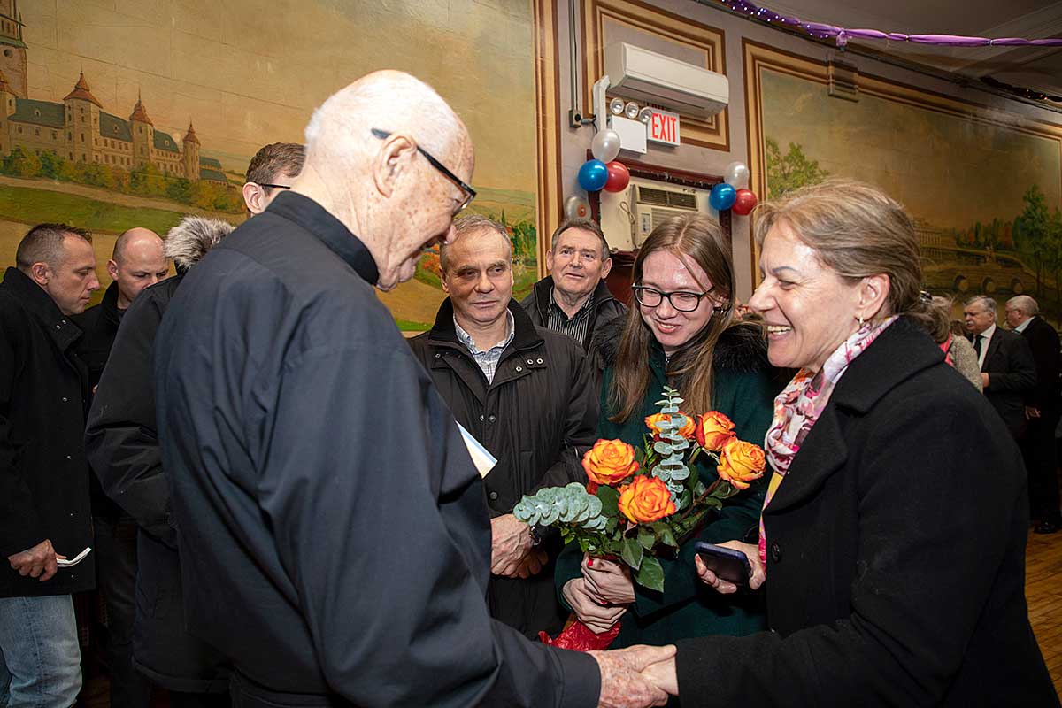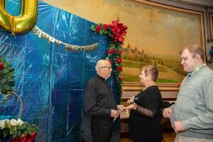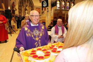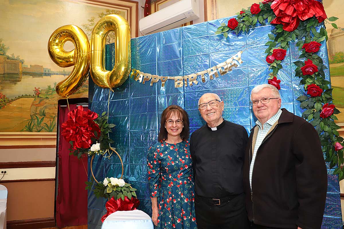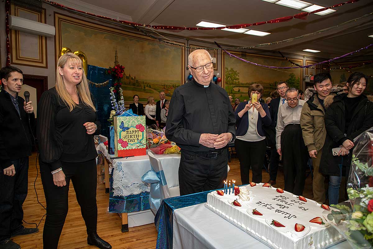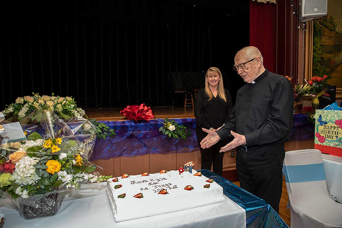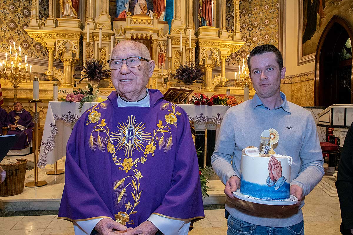 Po zakończeniu Mszy Św. Czcigodny Jubilat zaprosił wszystkich wiernych na poczęstunek do audytorium przy szkole Św. Stanisława Kostki przy Newel St. Kilkaset osób składało życzenia szanownemu Jubilatowi stojąc w ogromnej kolejce. Dostawał kwiaty, życzenia, prezenty, oraz pamiątki a jedna z parafianek podarowała zdjęcie ze ślubu swojej mamy którego udzielał ponad 40-lat temu w tym kościele. Wszyscy robili pamiątkowe zdjęcia z księdzem.