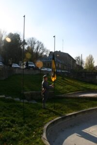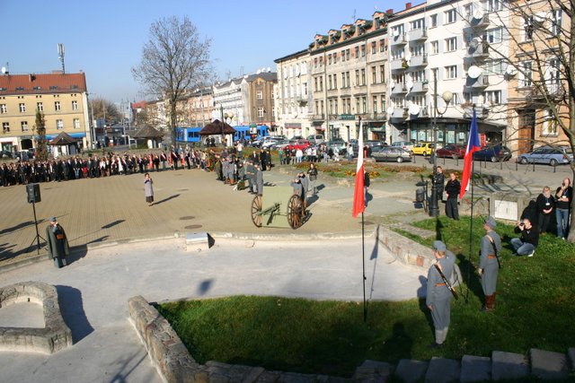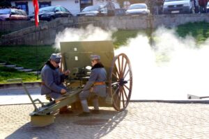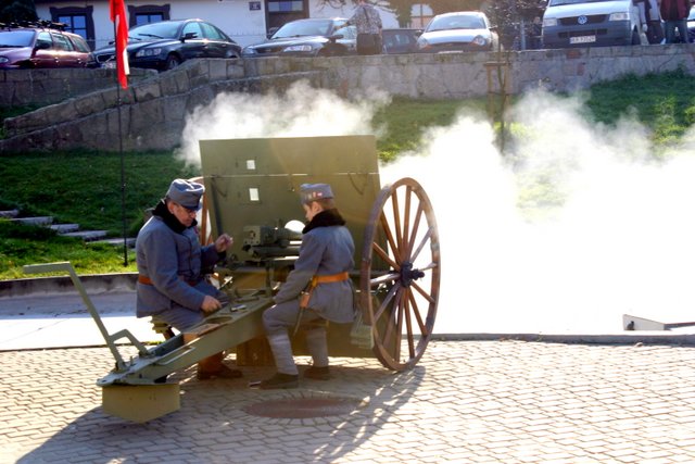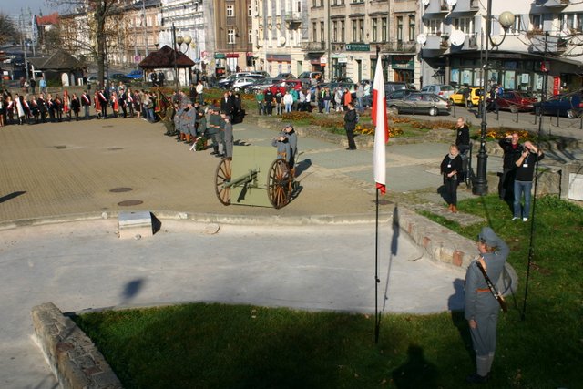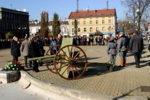 Ku chwale Niepodległej Polski kanonier Oddziału C. i K. Regimentu Artylerii Fortecznej No. 2 oddał trzykrotną salę z historycznej armaty.