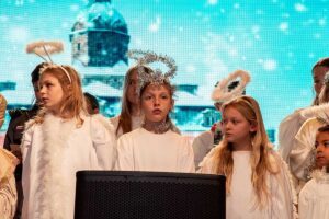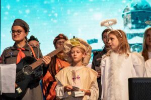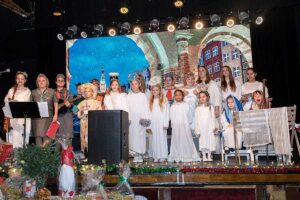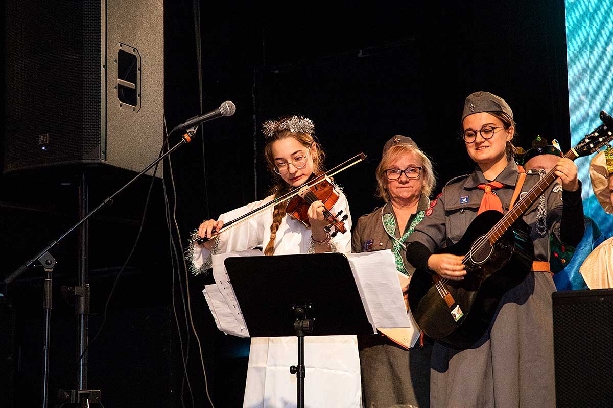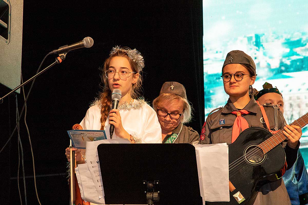 Były też życzenia – nadziei, pokoju, spokoju i podziękowanie rodzicom za ich trud i życzenie aby każde dziecko na świecie miało bezpieczny dom. Zuchy, skrzaty, harcerki, harcerze przeplatały tekst pięknie śpiewając kolędy i pastorałki ktore zachwycily zebranych gosci na oplatku. Szczególnie wzruszające byla pastorałki “Skrzypi wóz” w wykonaniu Hani I. oraz “Gore gwiazda Jezusowi” w wykonaniu Natalki M.