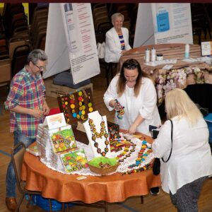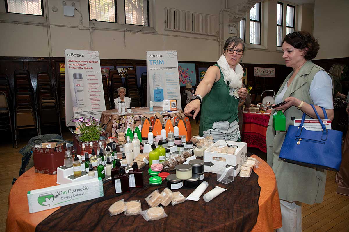 Szesnastu wystawców pokazywało swoje wyroby: artystyczną biżuterię zrobioną z różnych materiałów, ceramikę, rękodzieła, ekologiczne kosmetyki, bransoletki, wyroby na drutach, wypieki, kolorowe pierniki, babeczki i inne słodkości. Osobny stolik dla swoich wyrobów mieli członkowie Centrum Seniora Krakus.