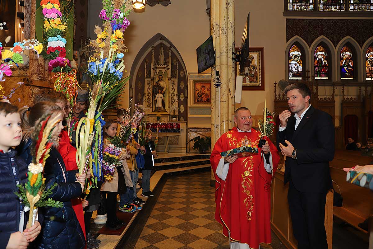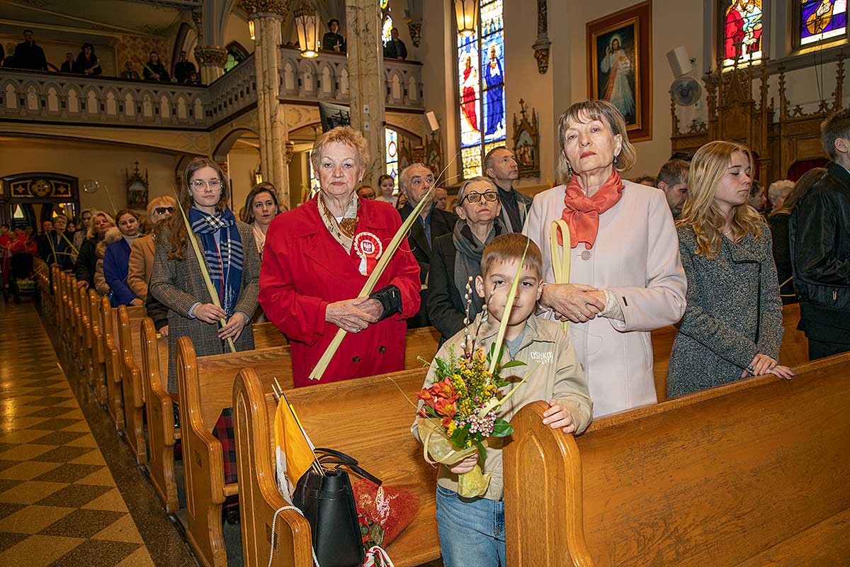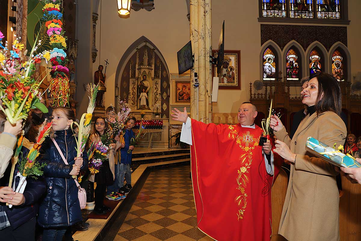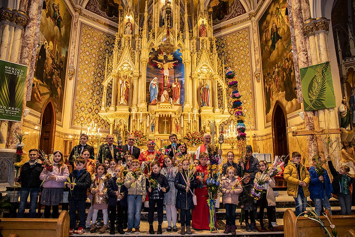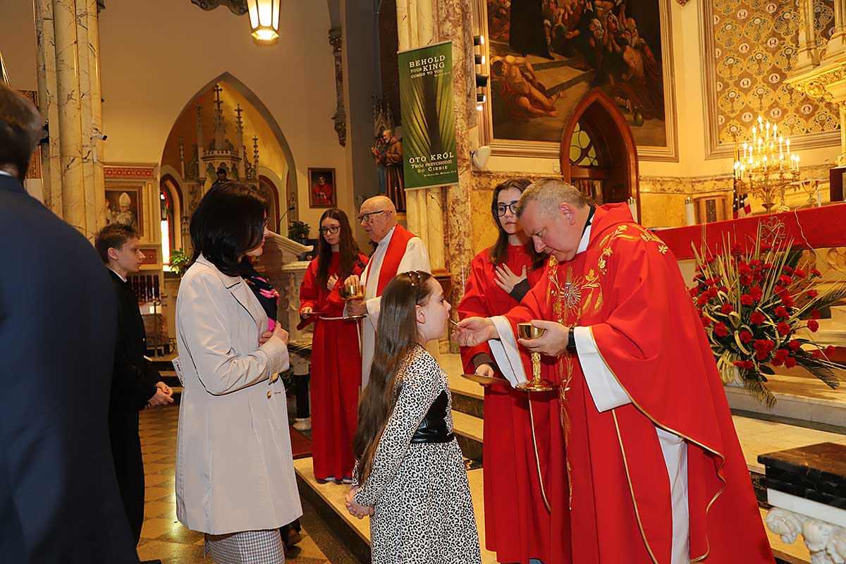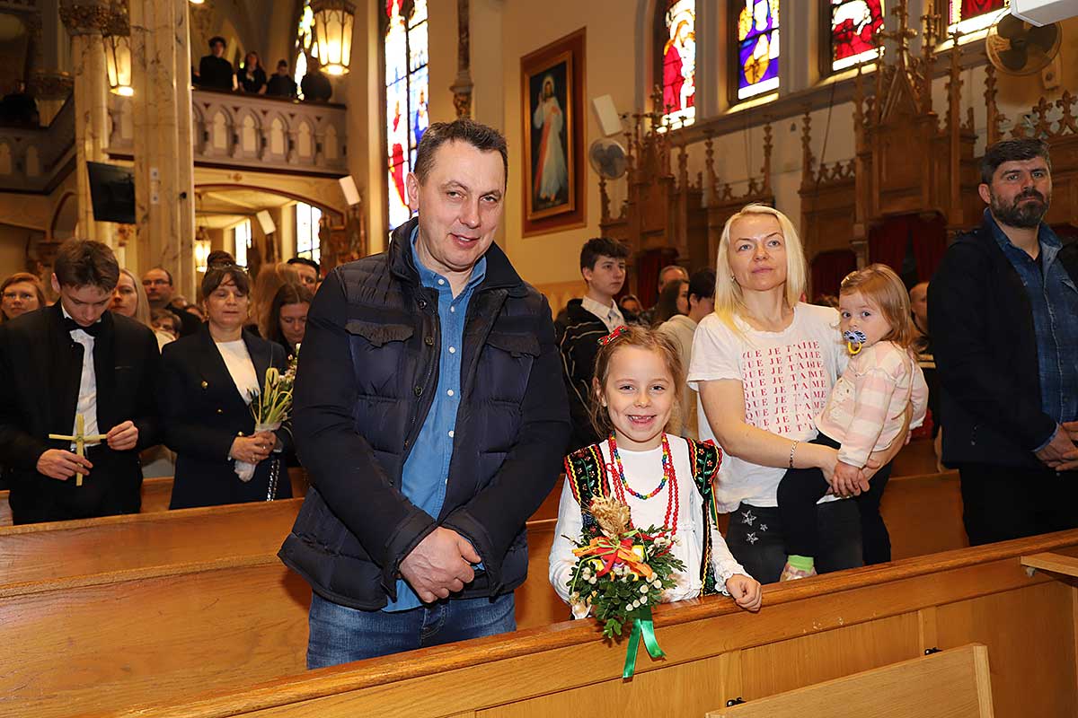 Mszę Św. koncelebrował proboszcz ksiądz Grzegorz Markulak, a czytania i psalmy wykonali ministranci. Dzieci przyniosły własnoręcznie przygotowane palmy wielkanocne i po mszy przeprowadzono konkurs na najwyższą i najpiękniejszą palmę. Jurorami byli: Konsul Generalny – Adrian Kubicki, Bogdan Chmielewski i Anna Branas z PSFUK. Wyłoniono zwycięzców: Emilia Idec (najwyższa palma) i Alan Boguski (najpiękniejsza), a dodatkowo jurorzy ufundowali nagrodę Konsula i Unii Kredytowej: tu wyłoniono dwoje zwycięzców: najmłodsza z uczestniczek Sophia Klusek oraz Gabriel Drozd za palmę w papieskich i polskich barwach.