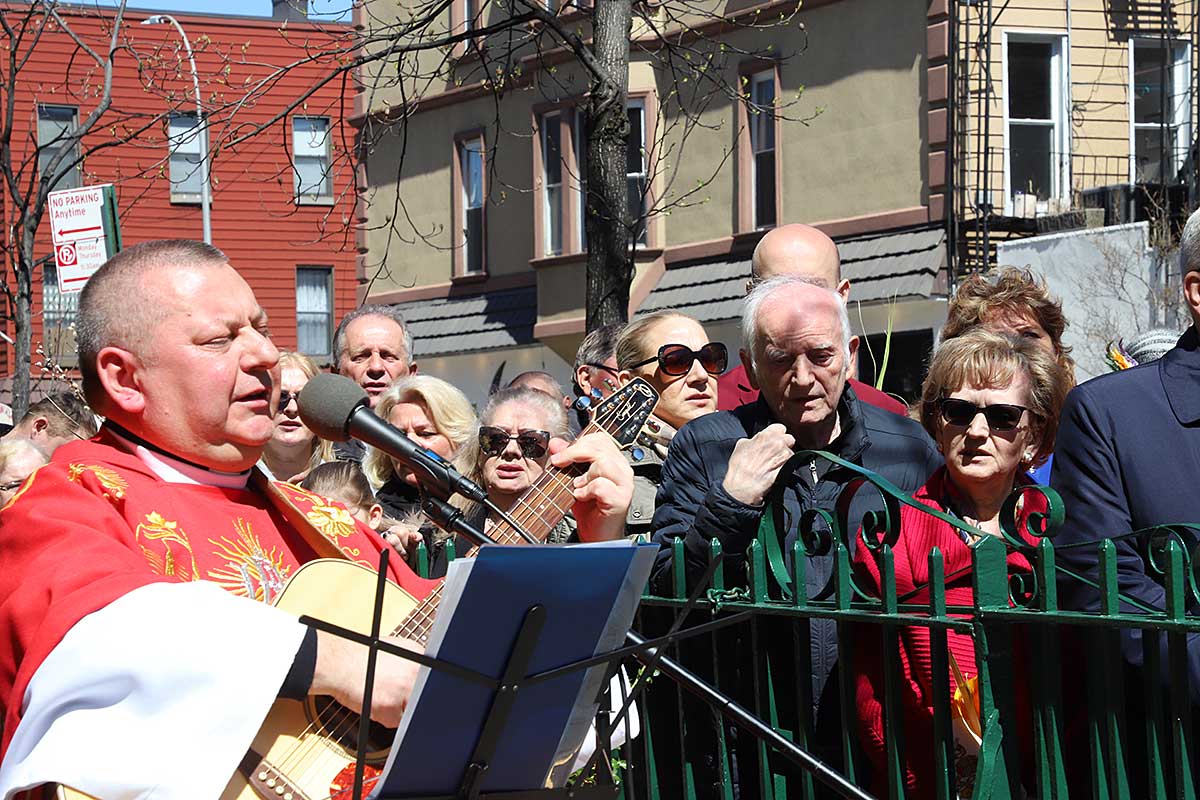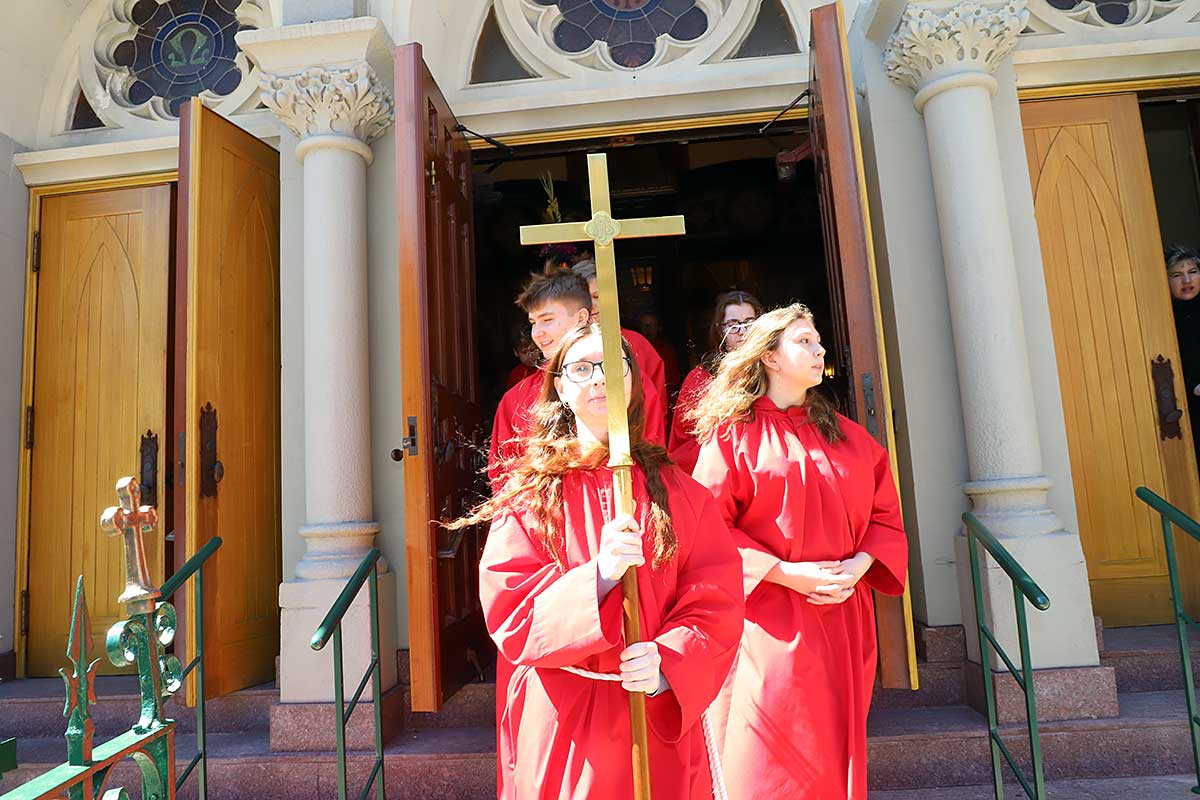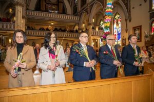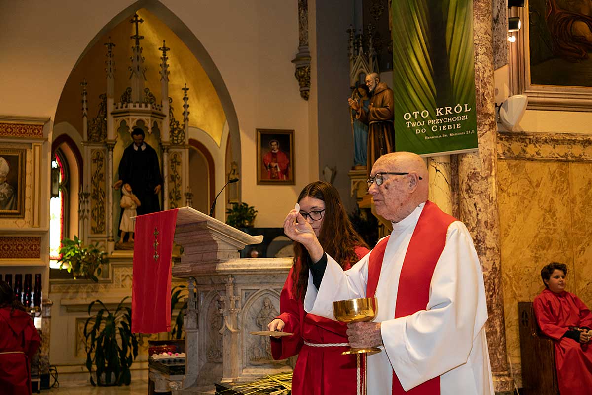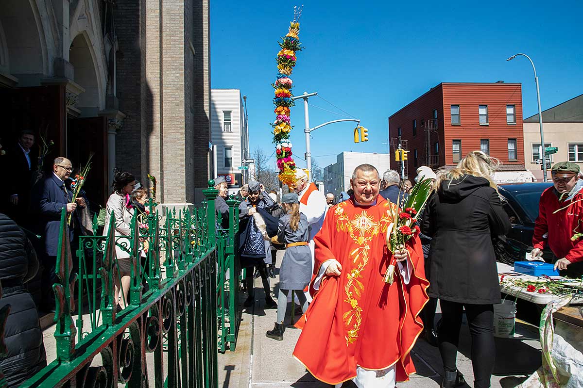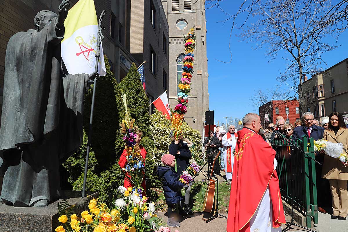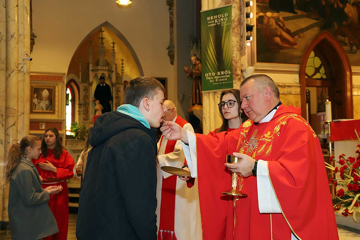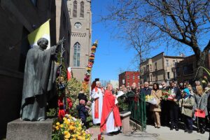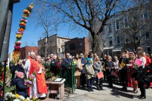 Mszę Św. koncelebrował proboszcz ksiądz Grzegorz Markulak, a czytania i psalmy wykonali ministranci. Dzieci przyniosły własnoręcznie przygotowane palmy wielkanocne i po mszy przeprowadzono konkurs na najwyższą i najpiękniejszą palmę. Jurorami byli: Konsul Generalny – Adrian Kubicki, Bogdan Chmielewski i Anna Branas z PSFUK. Wyłoniono zwycięzców: Emilia Idec (najwyższa palma) i Alan Boguski (najpiękniejsza), a dodatkowo jurorzy ufundowali nagrodę Konsula i Unii Kredytowej: tu wyłoniono dwoje zwycięzców: najmłodsza z uczestniczek Sophia Klusek oraz Gabriel Drozd za palmę w papieskich i polskich barwach.