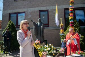 Zgromadzeni pod pomnikiem uczniowie Polskiej Szkoły im. Marii Konopnickiej przedstawili program artystyczny: recytowali wiersze i czytali fragmenty z nauczania Św. Jana Pawła II, fragmenty poezji dla JP II pisane przez wiernych. Dyrektorka Danuta Bronchard wyraziła przekonanie, że “dorośli muszą przypominać i wskazywać dzieciom drogę i nauki, które głosił Jan Paweł II, nie tylko w kościele i na religii.”