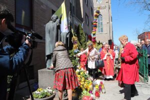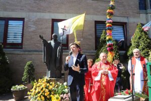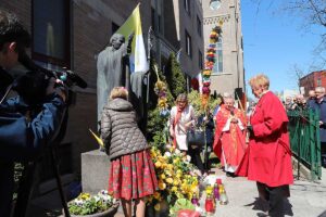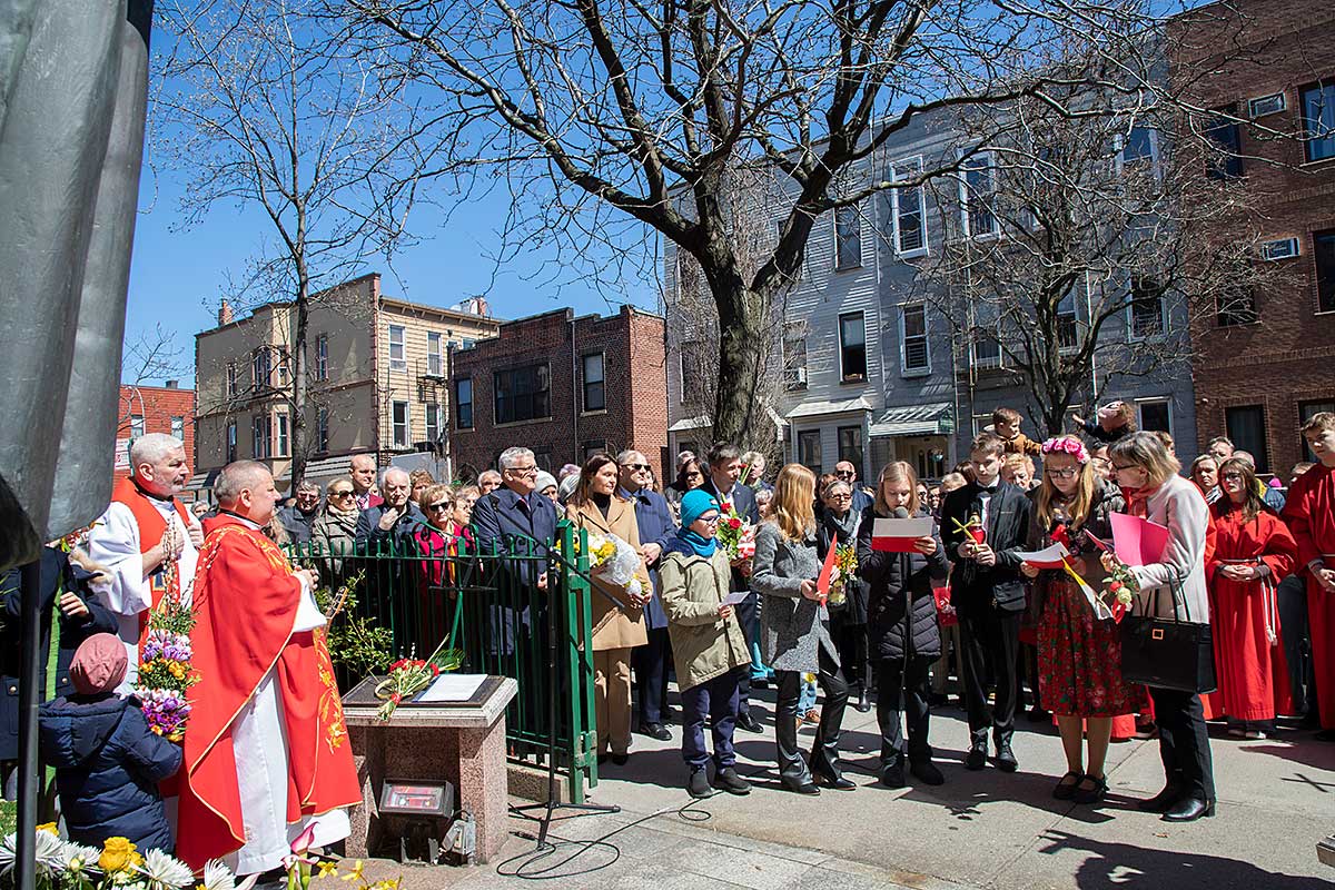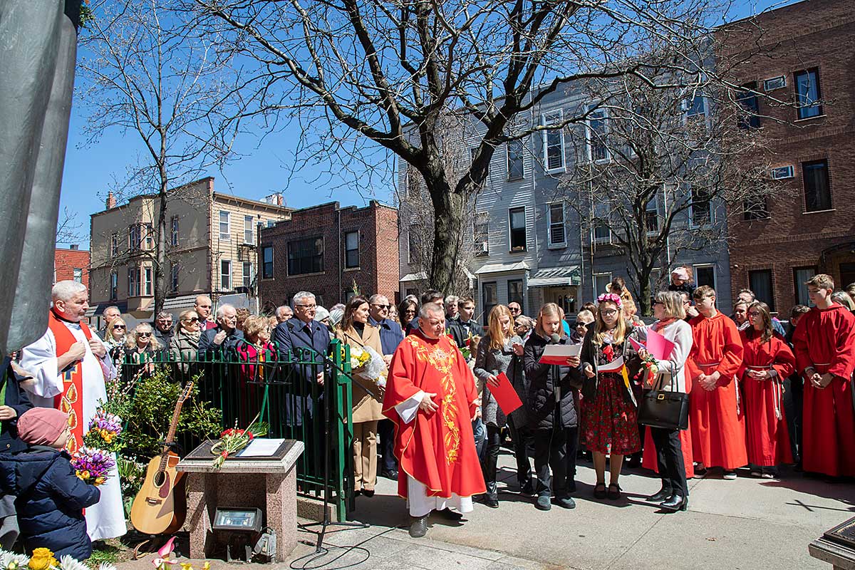 Danuta Bronchard przypomniała, iż pomnik jest dłuta Karola Partyki, poświęcony był 18 listopada 2000 roku, a powstał dzięki inicjatywie Johna Czaplińskiego i jego małżonki przy wsparciu materialnym wiernych. Nazwiska komitetu budowy oraz ofiarodawców są wypisane na mosiężnych tablicach umieszczonych przed pomnikiem.