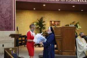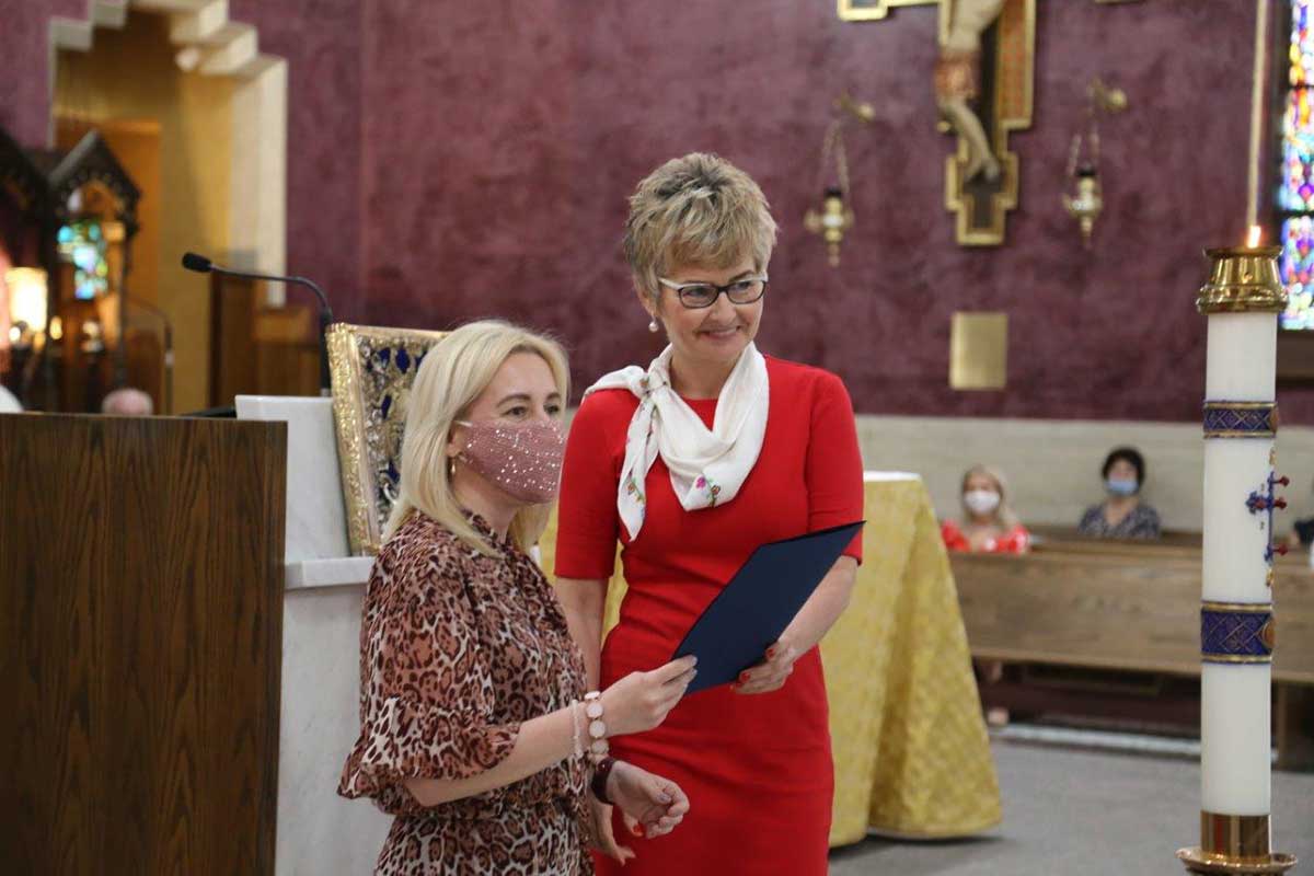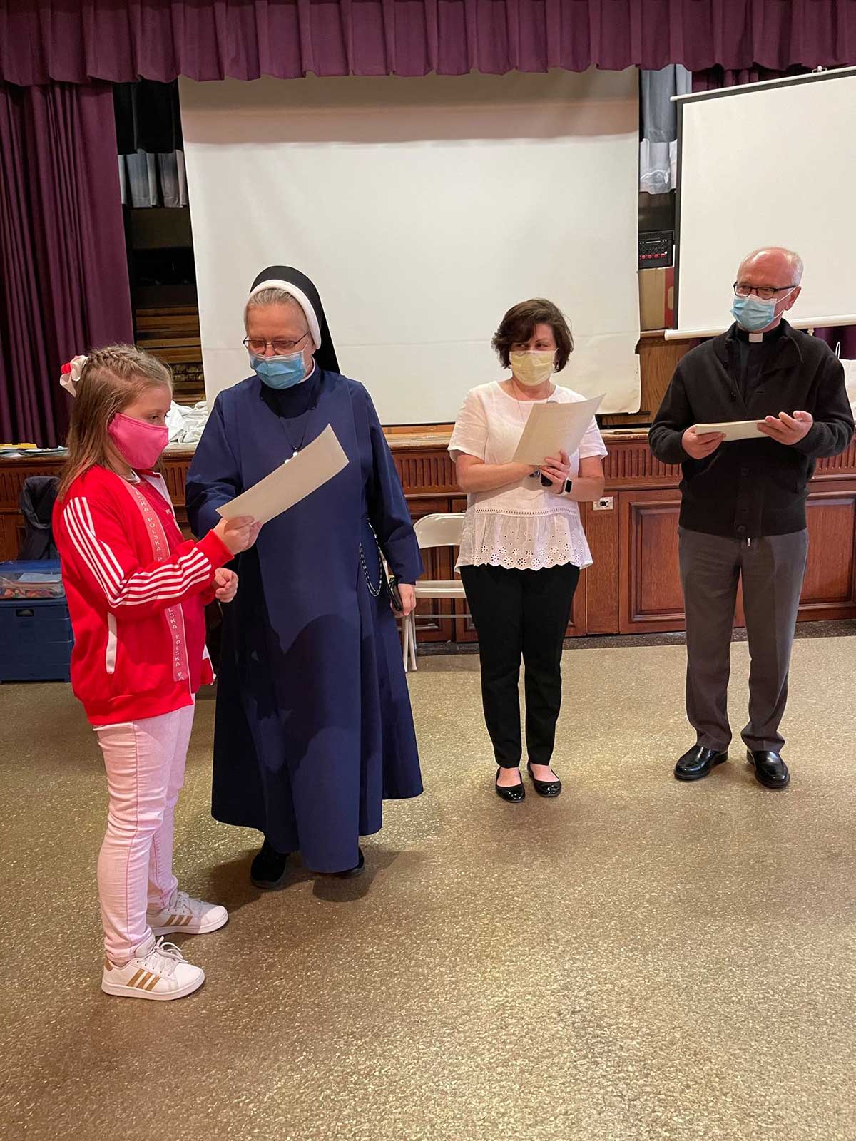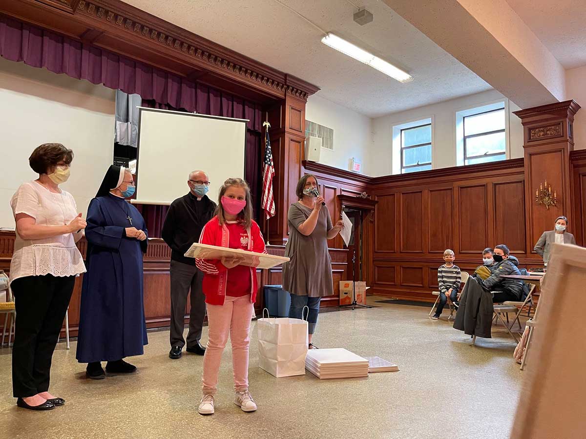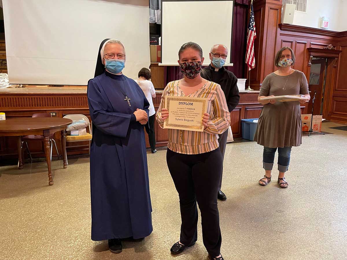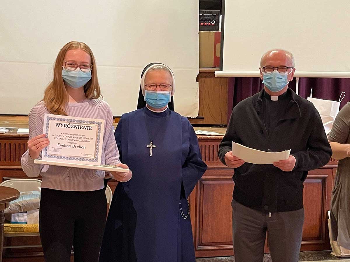 Siostra Jadwiga Zaremba, obecny dyrektor szkoły przywitała serdecznie Panią prezes Marię Pażdzior, Prezesa Polskich szkół na stan New Jersey oraz Pensylwanię oraz wyraziła wdzięczność pod adresem Pani Prezes CPSD Doroty Andraki za opiekę nad naszą szkołą w okresie pandemii. Pani Maria Pażdzior, wręczyła dyplomy zasłużonym Nauczycielom . Siostra Jadwiga w słowie powitalnym podziękowała Księdzu Proboszczowi za jego troskę o szkołę a także Mederatorowi szkoły Ks. Tadeuszowi Mierzwa, PhD, za jego współpracę z gronem pedagogicznych oraz pomoc szkole, a także skierowała słowa wdzięczności pod adresem Rodziców za ich zaufanie do naszej szkoły wyrażone w zapisywaniu swoich synów i córek do naszej szkoły a także wyraziła radość z licznej obecności uczniów na jubileuszowej uroczystości szkoły.