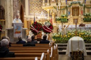 Wzruszającą homilię wygłosił proboszcz, ksiądz Marek Sobczak, przedstawiając obszernie życie i działalność Kapitana Chrościelewskiego, podkreślając jego zaangażowanie w sprawy Polonii oraz bliskie związki z parafią św. Stanisława Kostki.