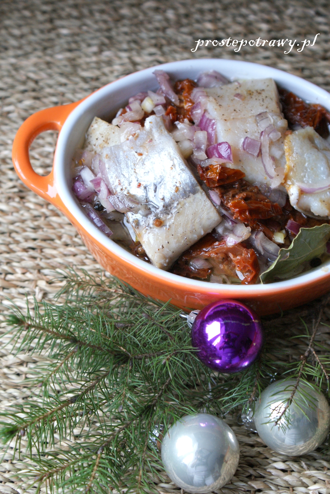 - W dużej misce wymieszaj ze sobą śledzie, cebulę, suszone pomidory, łyżkę z zalewy z suszonych pomidorów, liść laurowy i ziele angielskie. Dopraw świeżo zmielonym pieprzem