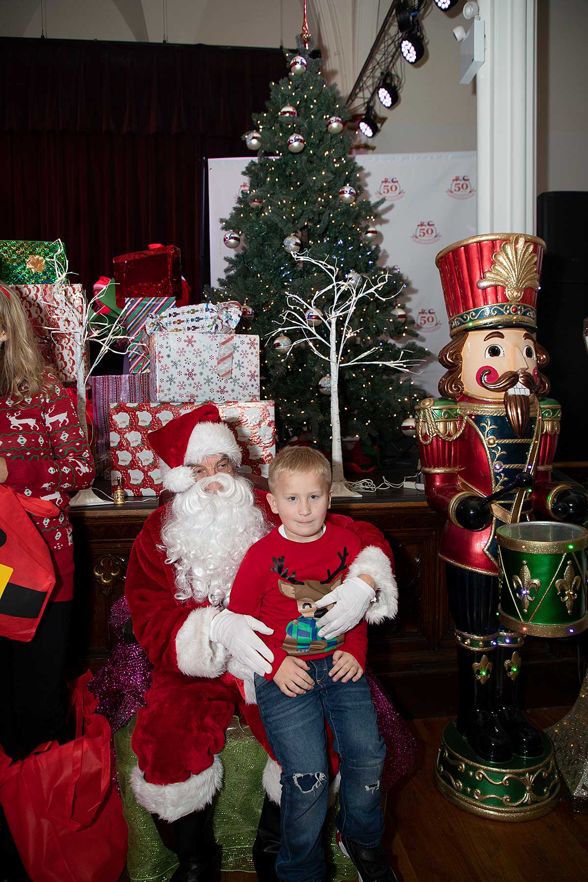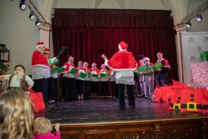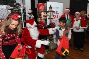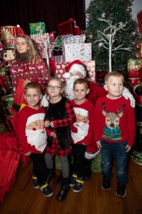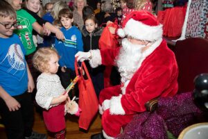 Po występach nadszedł długo wyczekiwany moment. Zapalono choinkę i wkroczył Św. Mikołaj w towarzystwie ślicznego Elfa. Ustawiła się do niego bardzo długa kolejka, ale prezentów zapakowanych w duże czerwone worki starczyło dla wszystkich. Potem dzieci pozowały do zdjęć z Mikołajem oraz raczyły się pierożkami i słodyczami.