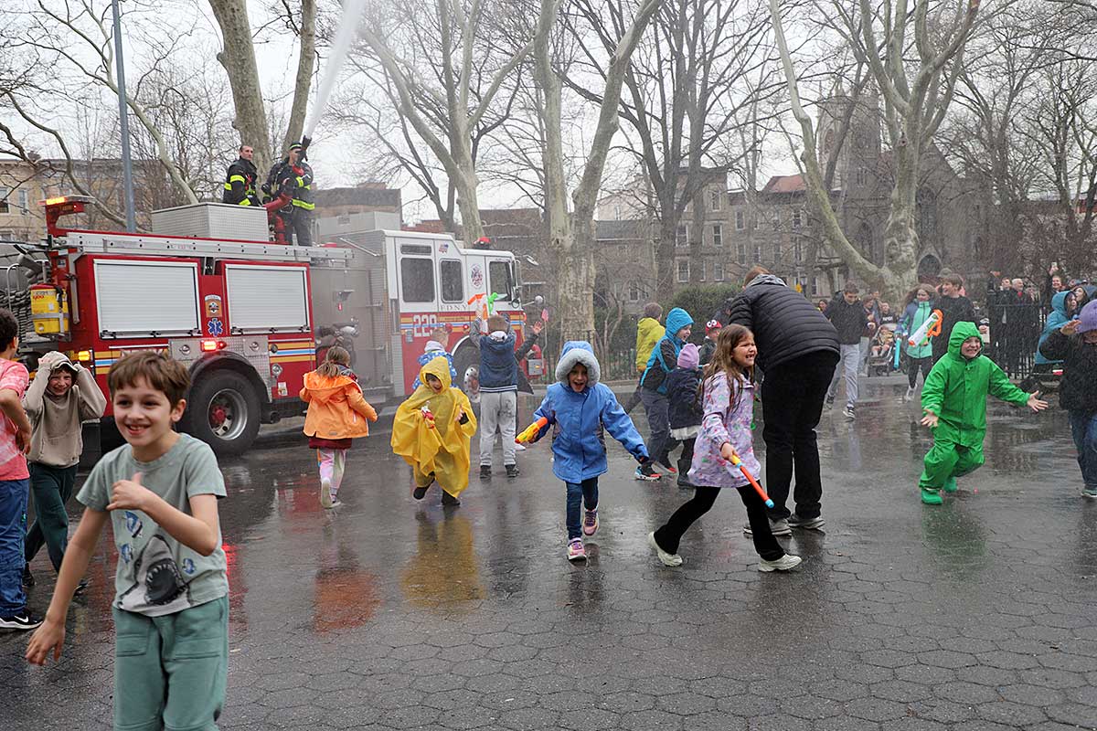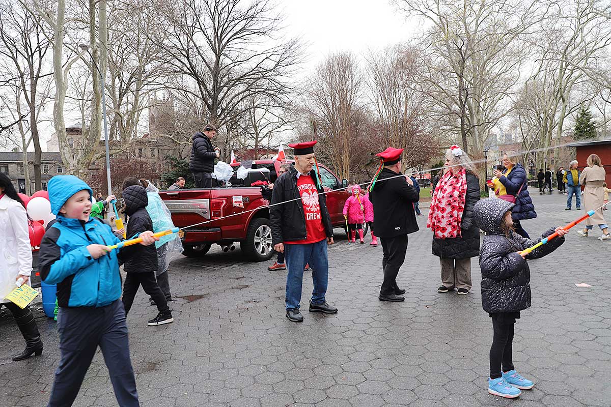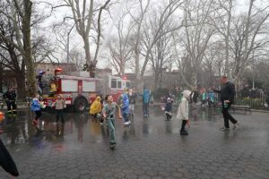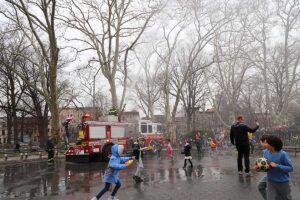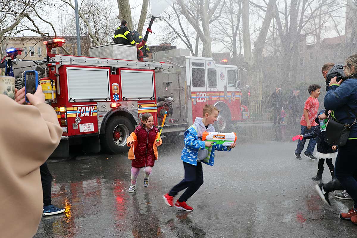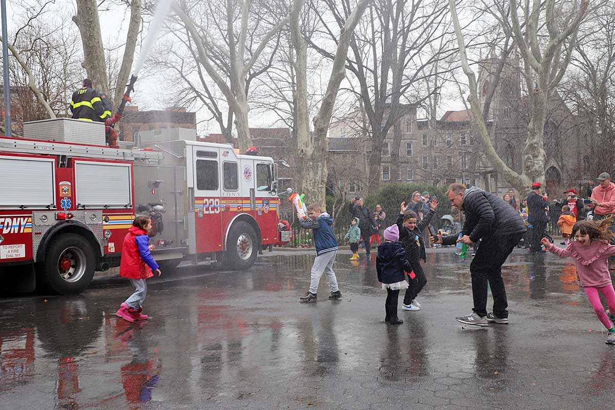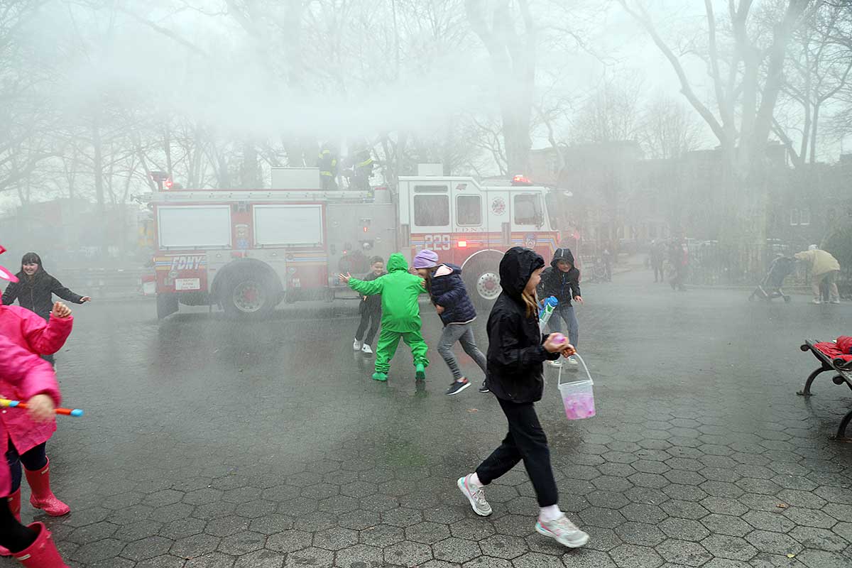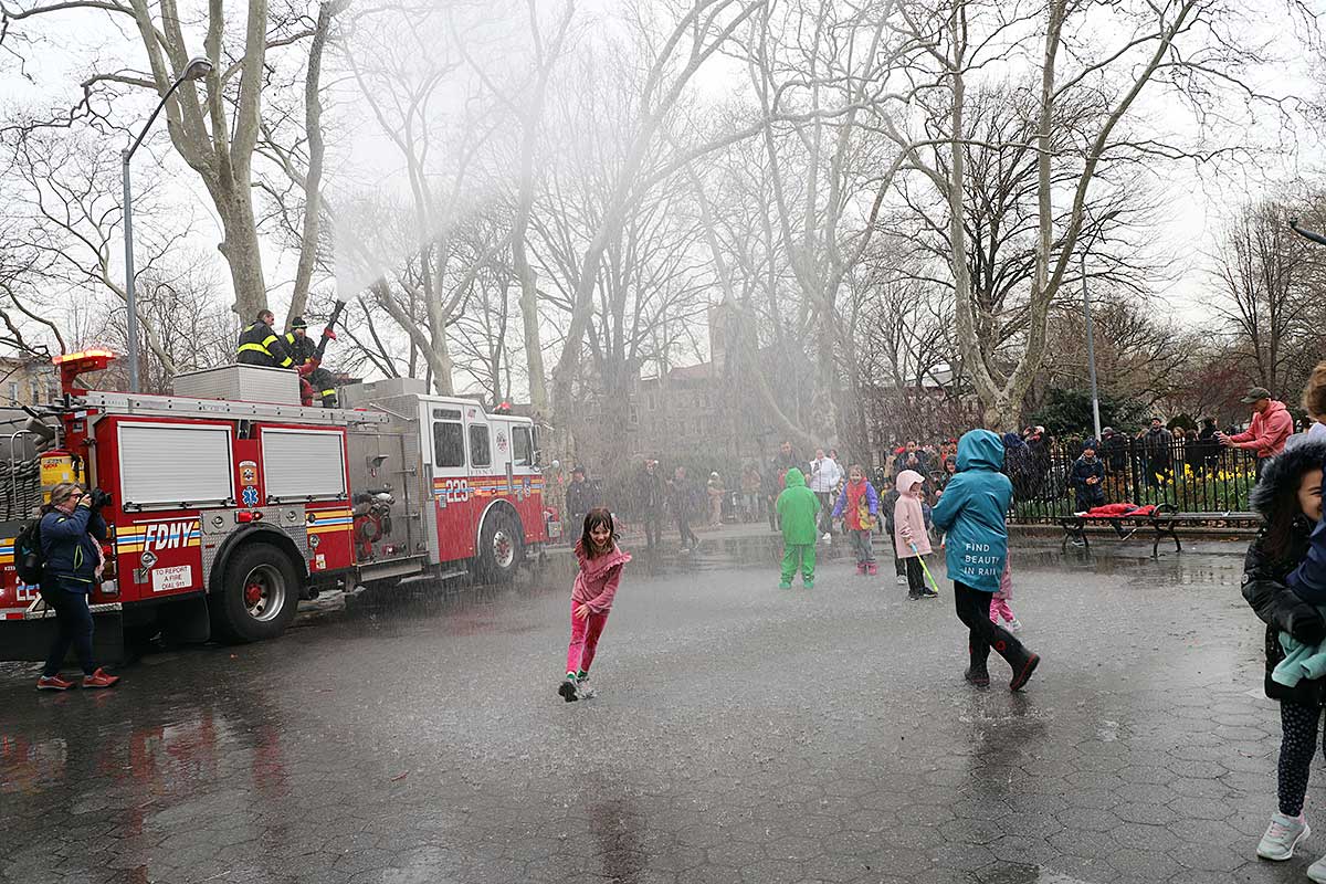 Zaraz po wejściu do parku przywitał Paradę wóz strażacki Engine 229 i zaczęła się zabawa polewania wodą “Śmigus- Dyngus”. Dzieci i dorośli biegali z psikawkami, a z góry poleciała struga wody z wozu strażackiego nie pozostawiając na nikim suchej nitki. Po tak świetnej zabawie, wszyscy mogli napić się gorącej herbaty i kawy oraz zjeść ciepły posiłek. Wszyscy organizatorzy i wolontariusze byli w czerwonych koszulkach “Dyngus Day Crew”.