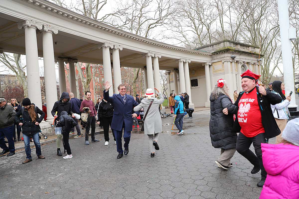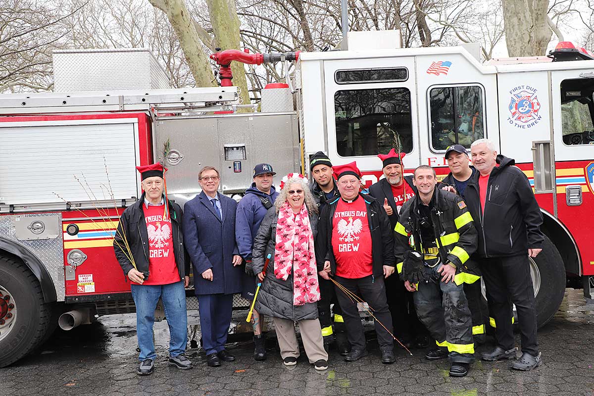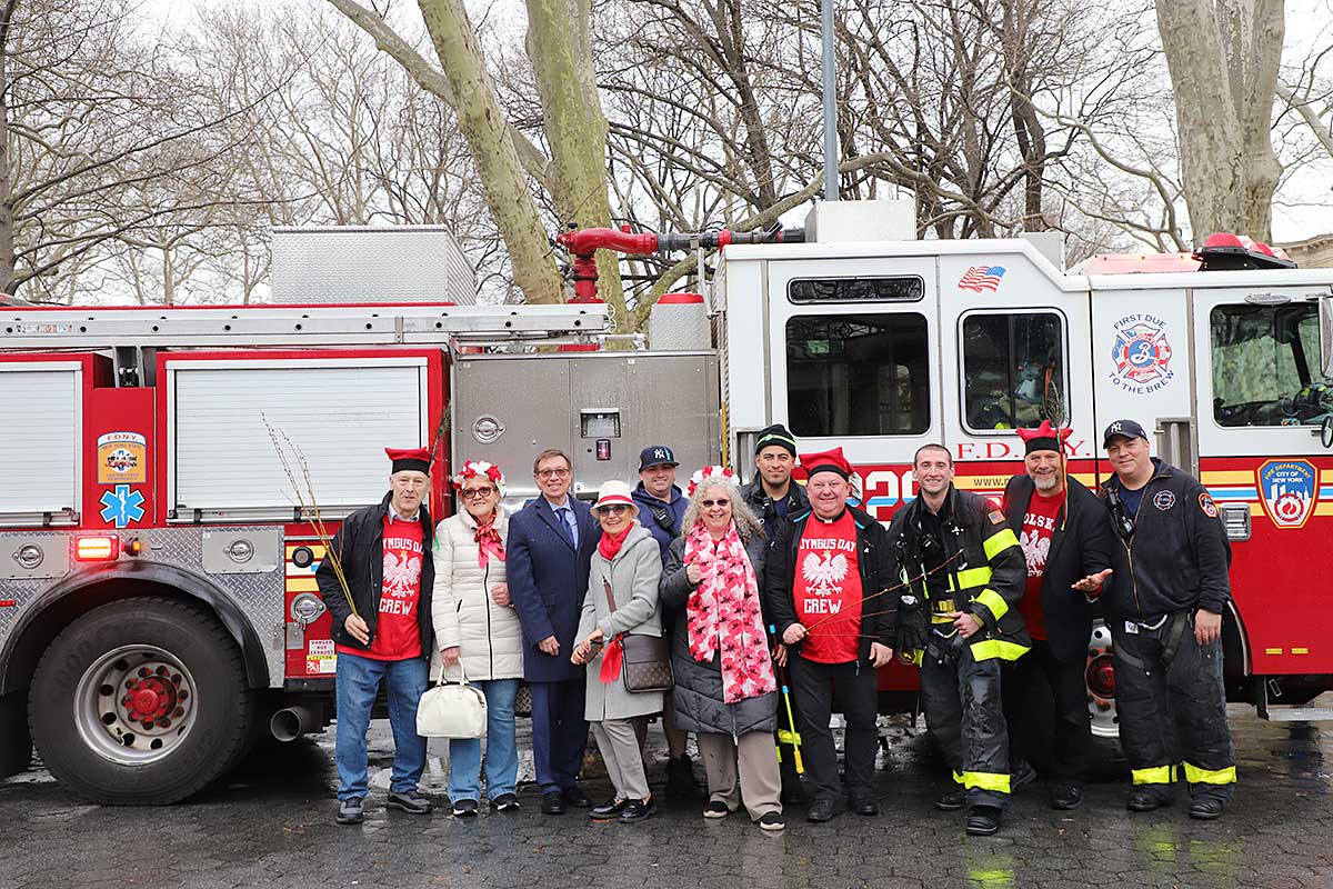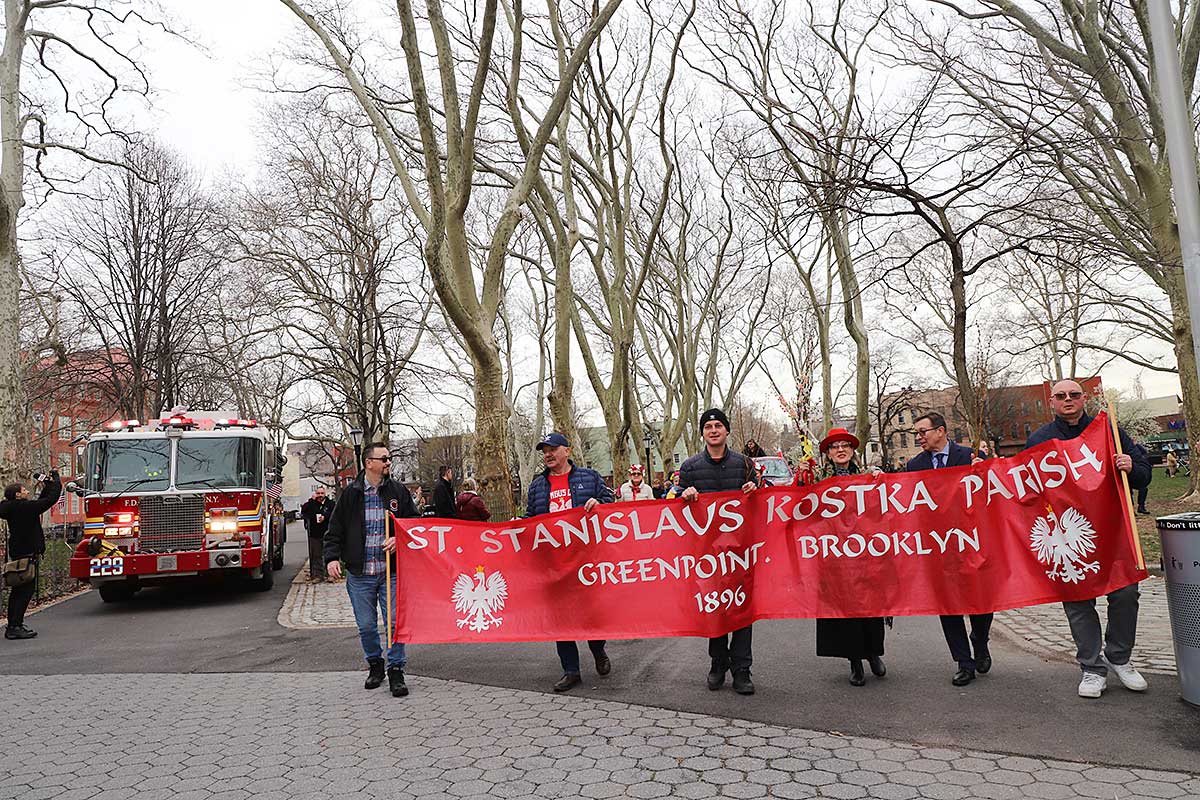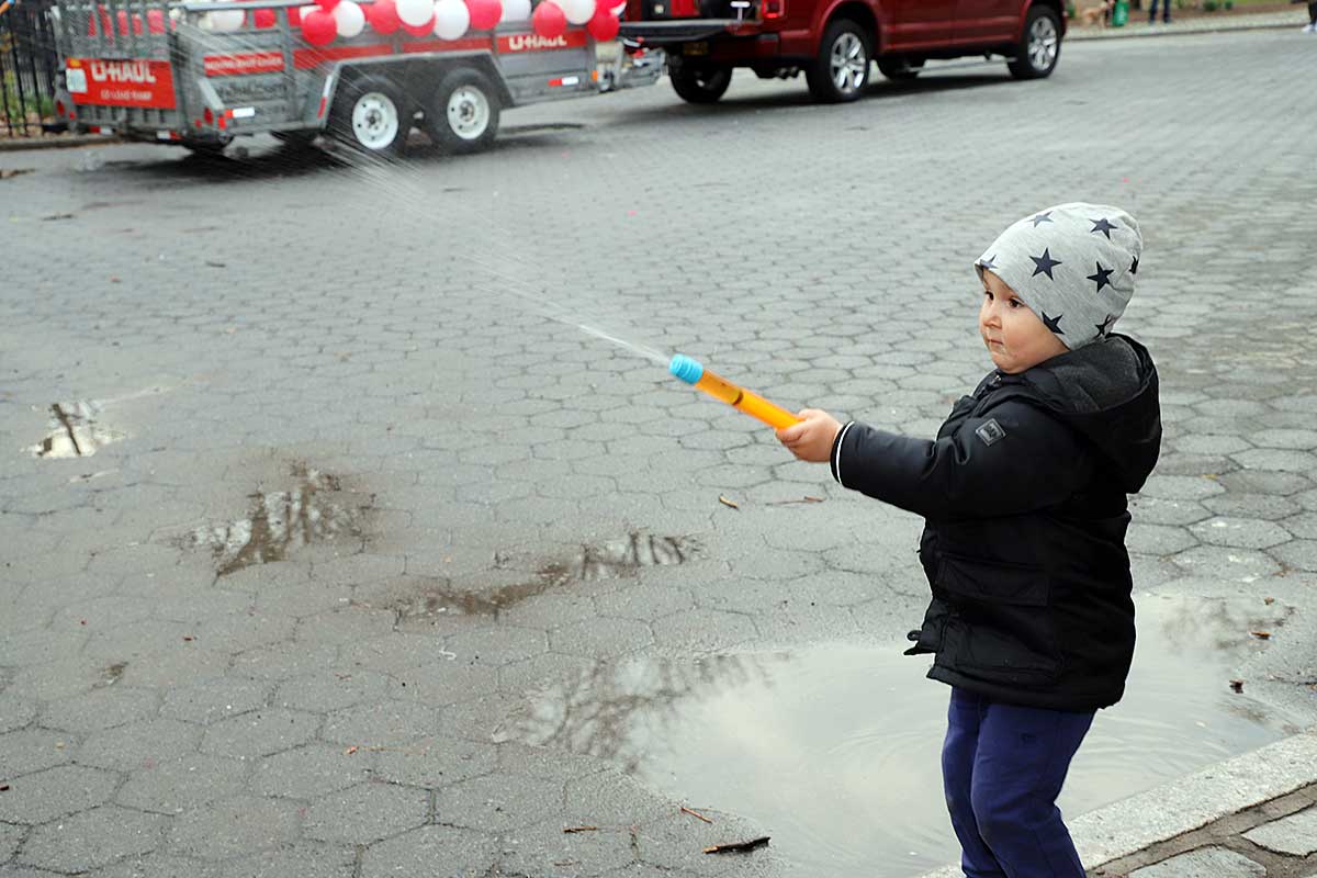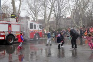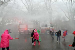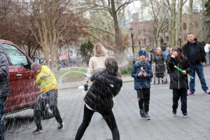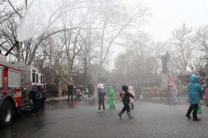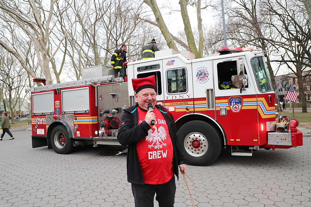 Zaraz po wejściu do parku przywitał Paradę wóz strażacki Engine 229 i zaczęła się zabawa polewania wodą “Śmigus- Dyngus”. Dzieci i dorośli biegali z psikawkami, a z góry poleciała struga wody z wozu strażackiego nie pozostawiając na nikim suchej nitki. Po tak świetnej zabawie, wszyscy mogli napić się gorącej herbaty i kawy oraz zjeść ciepły posiłek. Wszyscy organizatorzy i wolontariusze byli w czerwonych koszulkach “Dyngus Day Crew”.