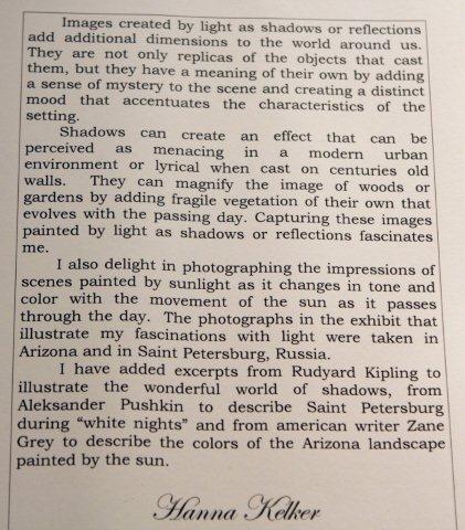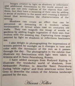 On the 20th of May 2011 Kurier Plus hosted an opening of an exhibition of photographs by Hanna Kelker titled “Painted by Light”. The artist showed 27 photographs covering her pursuits in three areas: Shadows and Reflections, cityscapes of Saint Petersburg (Russia) in July, and landscapes from Arizona.